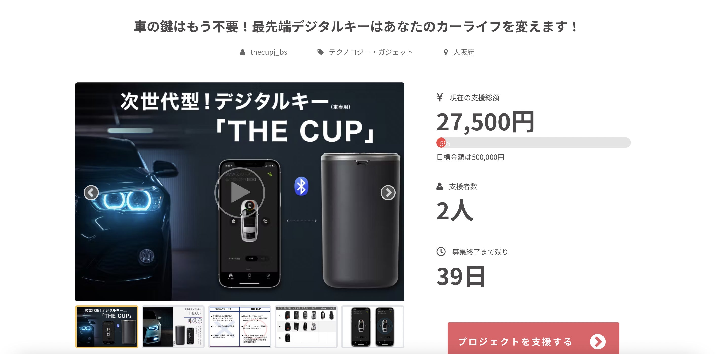 「THE CUP」に興味をお持ちいただきありがとうございます!日本販売に向けて「THE CUP」プロジェクトは、進行中です。皆様からのご支援、応援を心よりお待ちしています!!!*GWも終わり、レジャー・旅行へおでかけされたみなさんも多かったのではないでしょうか? そんな車の利用中に、こんな経験はありませんか???こういったトラブルを解消すべく!開発されたのが「THE CUP」です。THE CUPは、スマートフォンさえあれば車のキー操作が可能になります!ぜひ、プロジェクト本文を一度ご確認いただきご支援の程よろしくお願い致します!※「THE CUP」についてご不明な点はありませんか???「このタイプのスマートキーのような気がするんだけど。。。」「このスマートキーも対応しているかな???」など、少しでも気になられましたら、ぜひ一度お問い合わせください!※メールは24時間受け付けております。(回答は平日10時〜16時)お問い合わせの際に、「ご利用中の車の車種(年式)」「スマートキーの写真」を合わせてお問い合わせいただきますと、スムーズにご案内ができます!「問い合わせしたのに返事がない!」「返事送っているけど届いている?」などお問い合わせに関するご不明点なども、当サイトメッセージからお尋ねください。また、メールの設定によっては迷惑メールフォルダーに分類されていることもありますのでそちらご確認も一度お願い致します。*支援者の皆様へこの度はご支援していただきありがとうございます!随時ご連絡いたしますので、今しばらくお待ちください。まだまだプロジェクトは進行中ですので、ぜひ周りの方にも宣伝していただけますと嬉しいです!よろしくお願い致します。ジェービエス株式会社