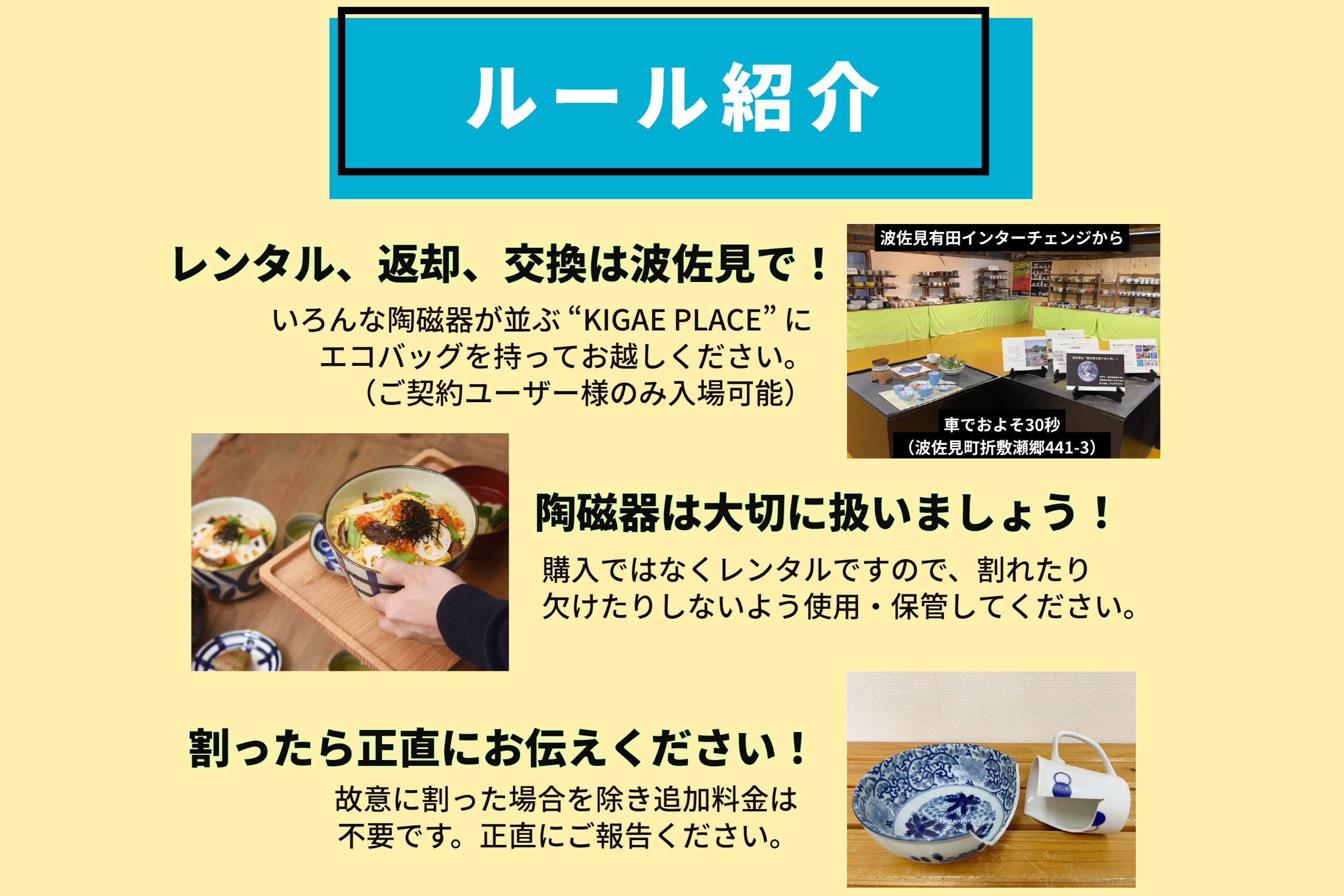 陶磁器のレンタル、返却、交換は波佐見有田インターチェンジそばの会場「KIGAE PLACE」で対応いたします。エコバッグを持ってご来場ください。