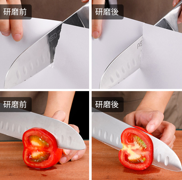 研磨後、包丁は鋭くなり、ものを切りやすくなります。