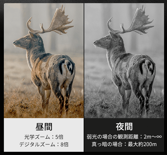夜間の光源(例えば街灯、月明かりなど)がある環境では、対物レンズの焦点距離と画面の明るさを調節すれば、対象物がはっきりと観測できます。また、赤外線ライトを付けると、光が弱い場所でも遠くまではっきり見えます。さらに大きなポイントとして、真っ暗闇の環境でも最大約200m先まで観測できます!