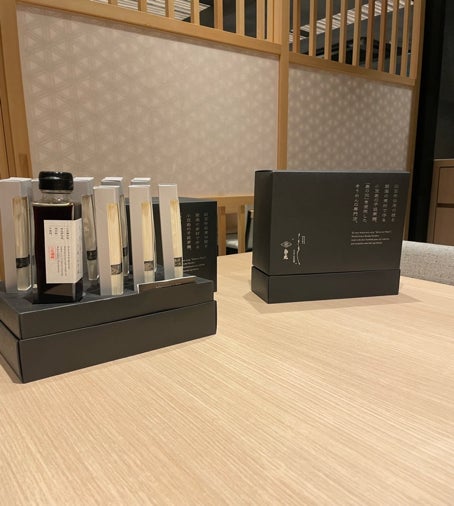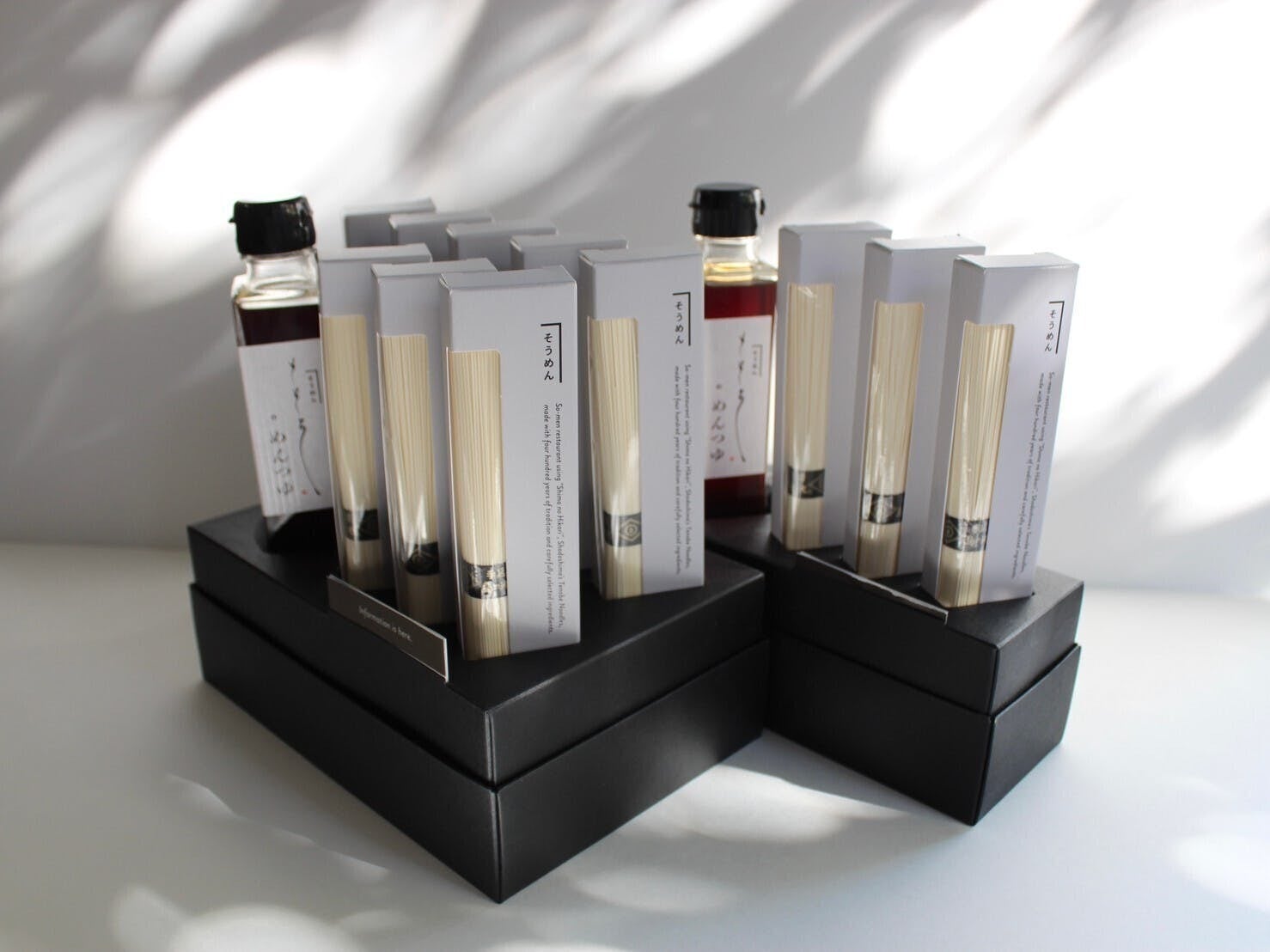 こちらのそうめんと麺つゆのギフトセットでございます。この中にはアレンジレシピも入っているのでお家でも簡単にお店の味を再現することが可能になっています。