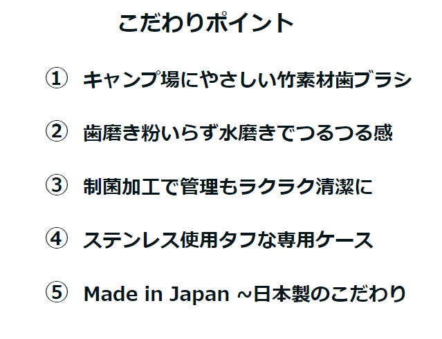 どなたでも扱いやすく、キャンプ場に出かけたくなるような商品の企画販売を心がけており、あるようでなかったアウトドア用歯ブラシセットを提案させて頂きました。