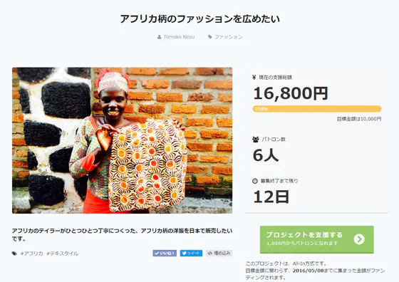 2016/04/26 23:33こんにちは!根津朋子です! プロジェクトがサクセスしました! 応援してくださった6名のパトロン様、誠にありがとうございました! コメントを読み、意外と男性の方が興味をもってくださっていることに驚きました。 そのおかげで、男性用の洋服や小物もつくっていくことに決まりました!!!! プロジェクトがサクセスしてテンションがあがっているので、 アフリカでビジネスをすることに興味を持った理由をちょっとだけ語りたいと思います。 2013年夏、私はケニアで2ヶ月間ホームステイをしていました。 (ホストマザーと家でケーキを切っているところ) ホストファザーは獣医をしながら学校の理事長をやっていて、ホストマザーは同じ学校の校長先生でした。ホストファザーは私をボランティアとして受け入れてくれて、さらにホームステイまでさせてくれました。 彼はたくさんのボランティアを受け入れています。 “この国の現状を知って、いろんなところで発信して欲しい。 それがこの国を変えるきっかけになればいい。” という理由からでした。 その村に住む多くの人は、外国人を見るとすぐに「金をくれ」と言ってきます。 しかし、彼はそのような姿勢に対して疑問を感じていました。 外国からの支援に頼るのではなく、自分たちの力で国を発展させていかなければいけないと強く思っていました。 私は彼に会うまで「アフリカの人たちは貧困でかわいそう。だから外国人が助けなきゃいけないんだ」と思っていましたが、彼に会ってその考えが大きく変わりました。 支援ではないなにかで、アフリカを変えたい。 支援する側と支援される側ではなく、対等な立場でアフリカ人と関わりたい。 そんな考えから ビジネス という手段に行き着きました。 Alizeti(アリゼティ)では「かわいそうだから買ってください」という売り出し方は一切していません。 かわいそうだから買うというのはお客様自身がのちに「なんで買ってしまったんだろう」と後悔すると思っています。 本当にいいものだと思ってくれた人に買って欲しいです。 もっと見る