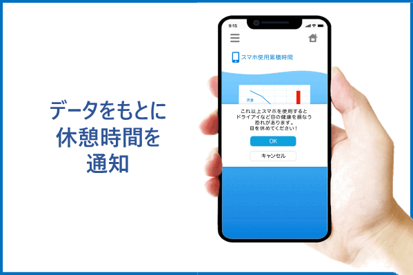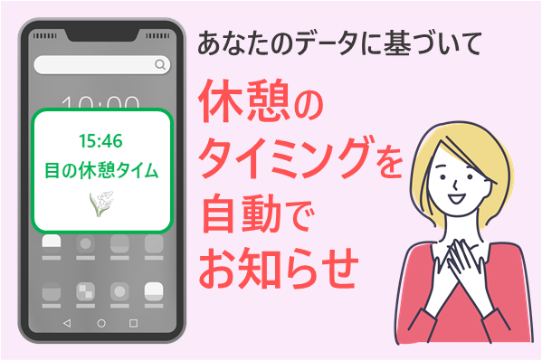学習を通して目が乾燥しやすい時間を自動で判別し、乾燥度の高いレッドゾーンに達する前にスマホから休憩を促す通知が届きます。乾く・痛いなどの症状が起きる前に目を休める目安となります。