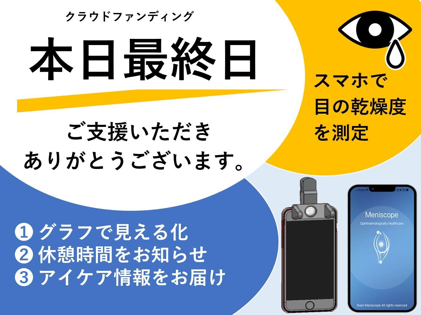 2022/06/10 08:00本プロジェクト「目のうるおいを測定して乾燥前に通知!目の健康管理アプリの開発」にご支援、ご声援をお送りいただき大変ありがとうございました。6月6日をもちまして、メニスコーププロジェクトのクラウドファンディングが終了となり、この度は目標金額未達成という結果になりましたが目の健康維持という、あまり身近では聞くことのない健康分野にも関わらず13名もの方々からご支援と応援のメッセージをいただき大変嬉しく、このプロジェクトを進めてゆく励みになりました。また、今回のプロジェクトのおかげで様々な方からアドバイスも頂く機会にも恵まれました。ジムやスーパーフードなど健康意識が高まっている一方、目の健康の大切さをお伝えしてゆくには、さらにご利用者様の視点に立ちつつ、より分かりやすく、よりメリットを感じていただけるように工夫する必要があると感じました。今回のプロジェクトを通しての商品のお届けは叶いませんでしたが、この結果を真摯に受け止め、皆様の健康をサポートできるような製品をお届けできるよう邁進してゆく所存です。繰り返しとなりますが、この度はたくさんのご支援、応援をありがとうございました。今後も「メニスコープ」プロジェクトを応援していただければ幸いです。感謝の気持ちとともに、皆様の健康を心よりお祈り申し上げます。Meniscopeプロジェクトチーム一同 もっと見る【本日最終日】暖かいご支援をいただきありがとうございます。