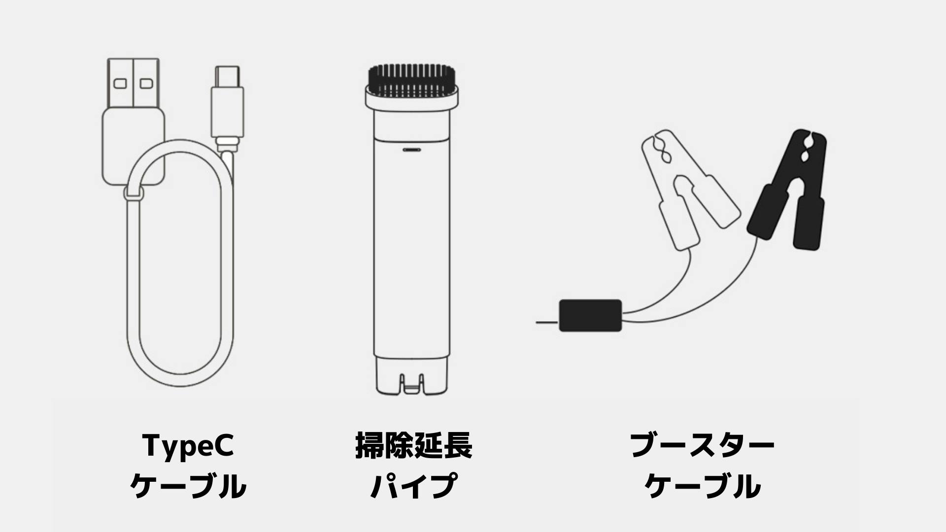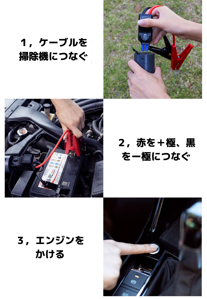 さらにうれしいことに車のバッテリーが上がったときの応急処置としても使用可能になります!「3in1車載掃除機」は専用のブースターケーブルを付属しています。万が一の時にも、ほかの車にバッテリーを借りることなく、自力でバッテリーを復活させることができます。