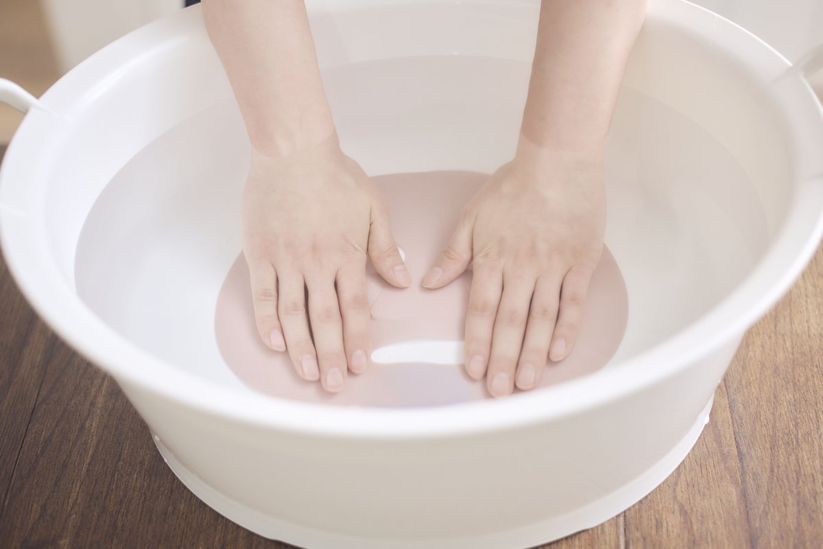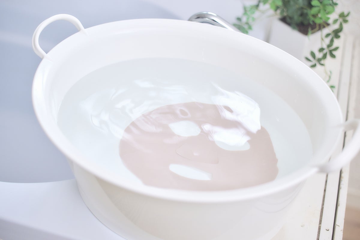 ① 桶や洗面器に水を溜め、中性洗剤を入れ(水2Lに対し液体洗剤5mL程度)、フェイスシートを浸します。