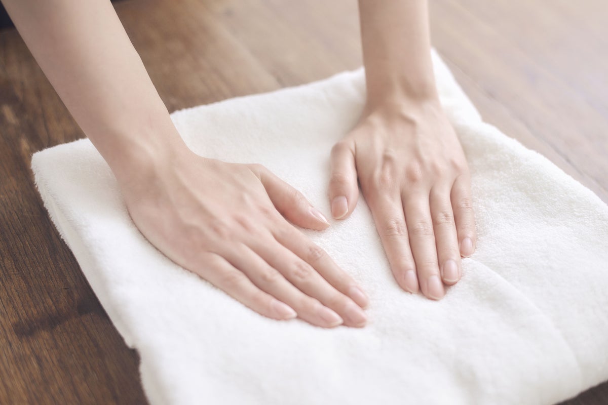 ④ タオルで挟み込むようにして、水気をきります。手で絞ることは避けてください。