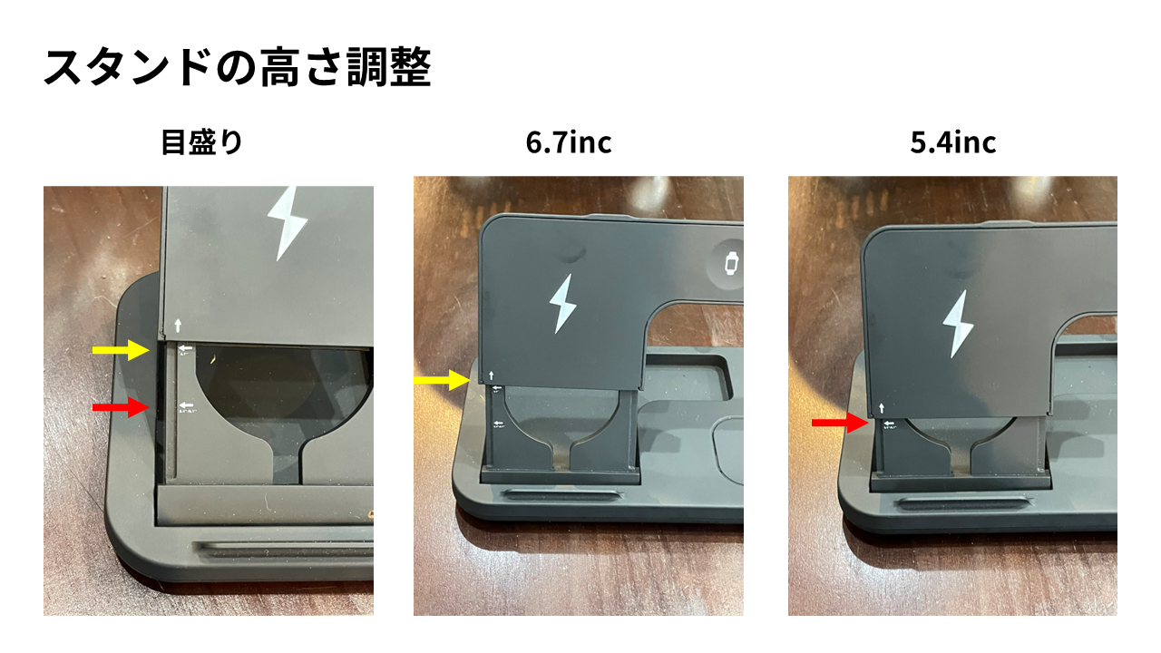 ②高さ調整6.7inc、5.4incサイズの目盛りに合わせて高さを変更可能です。