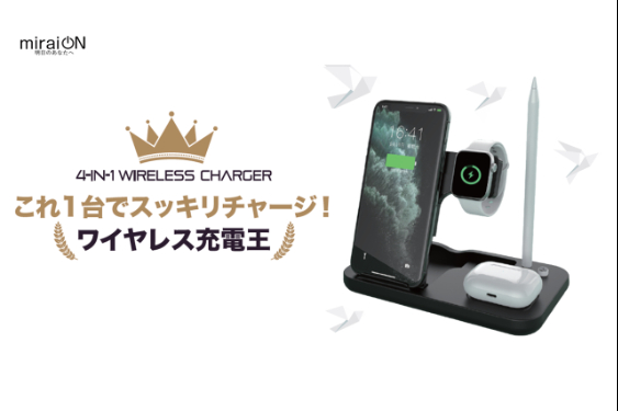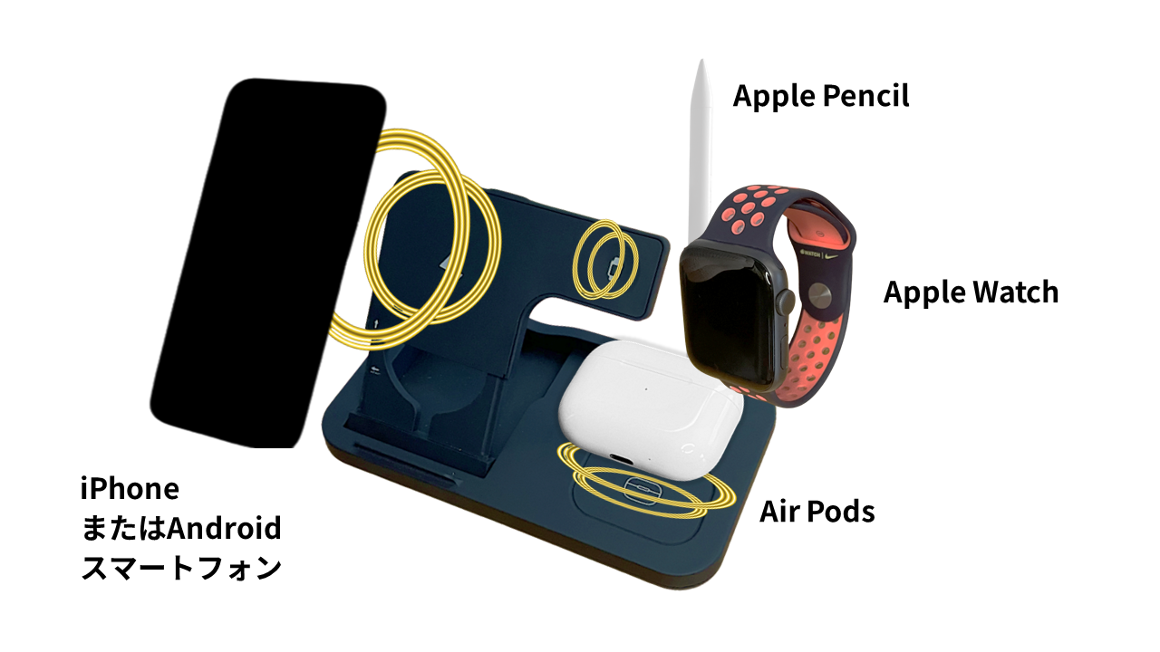 「ワイヤレス充電王」は、『iPhoneまたはAndroidスマートフォン』、『Apple Watch』、『Airpods』、『Apple Pencil』 ワイヤレス充電対応デバイスの4台を同時に充電できる4in1ワイヤレスチャージャーです。