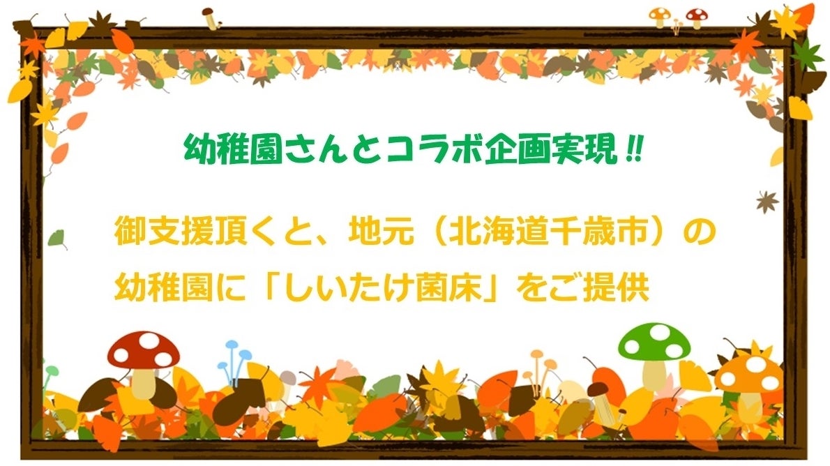 「皆様に御支援頂けると私の地元幼稚園に「しいたけの菌床」をお届けできる!」