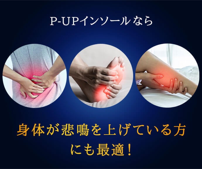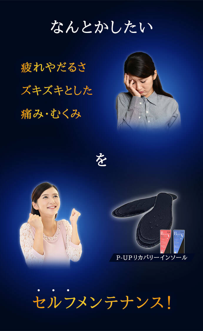 1日を終えた時、足が疲れて辛い、足・腰が冷える、疲れが取れないという人のために開発したのがP-UPリカバリーインソールです。