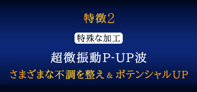 『P-UP超微振動』”P-UP波”とは、1秒間に1兆回もの振動で、内側から美と健康を引き出してくれることが期待できる遠赤外線の一種の「超美振動」。一部の鉱石や月の光、生まれたての赤ちゃんなどからも多く発せられている“生命の波長”とも言われています。