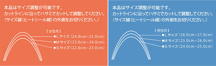 靴に入れて、入らなかった場合、線にそって切っていただくだけ、簡単にサイズの調整がご自分で可能です。