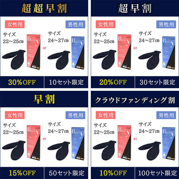 2023/05/21 20:00皆さま、たくさんのご支援誠にありがとうございます!5月20日のニュースレターでも紹介され、より多くの方に「P-UP リカバリーインソール」にご興味を持っていただき本当に嬉しく思います。ご好評につき、「超超早割」と「超早割」は完売となりました!ご検討中の方は「早割」15%OFFもお早めにチェックをお願いいたします。また、2点セットの「超早割」20%OFFも人気です!お仕事を頑張るご家族にもプレゼントとしていかがでしょうか?本プロジェクトは5月31日終了となります。残り10日、引き続きよろしくお願いいたします!Decouverte Team もっと見る
