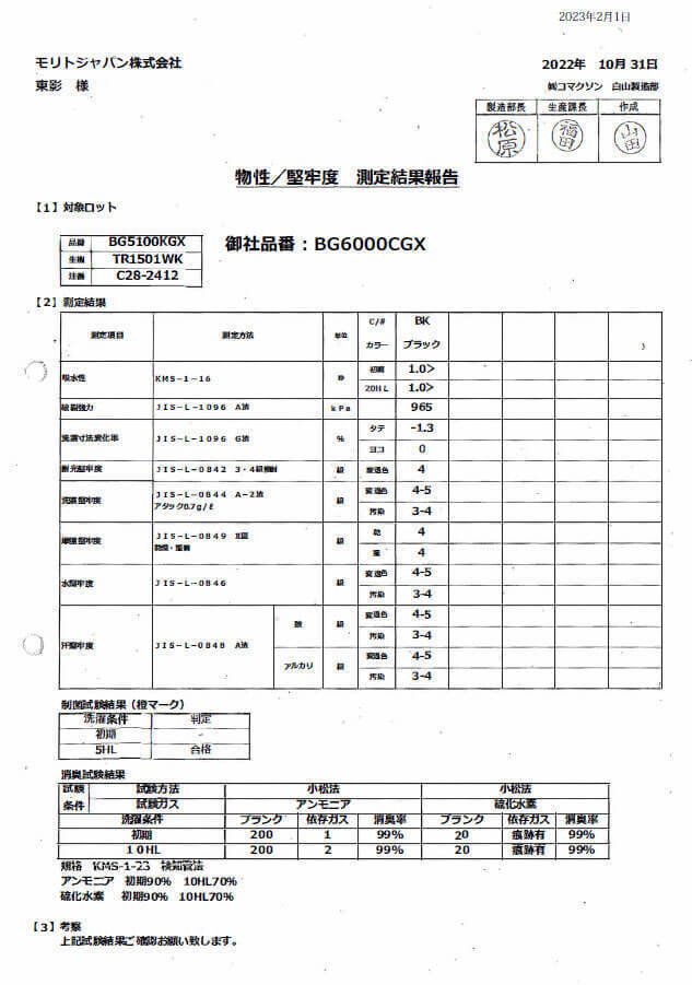 SEKマークの管理につきましては、一般社団法人 繊維評価技術協議会(繊技会)の定めに則り、適切に実施しております。一般社団法人 繊維評価技術協議会(sengikyo.or.jp)また、繊技協に対して、毎年性能および管理状況に関する確認報告(定期サーベイランス)が義務付けられており、こちらについても実施しております。