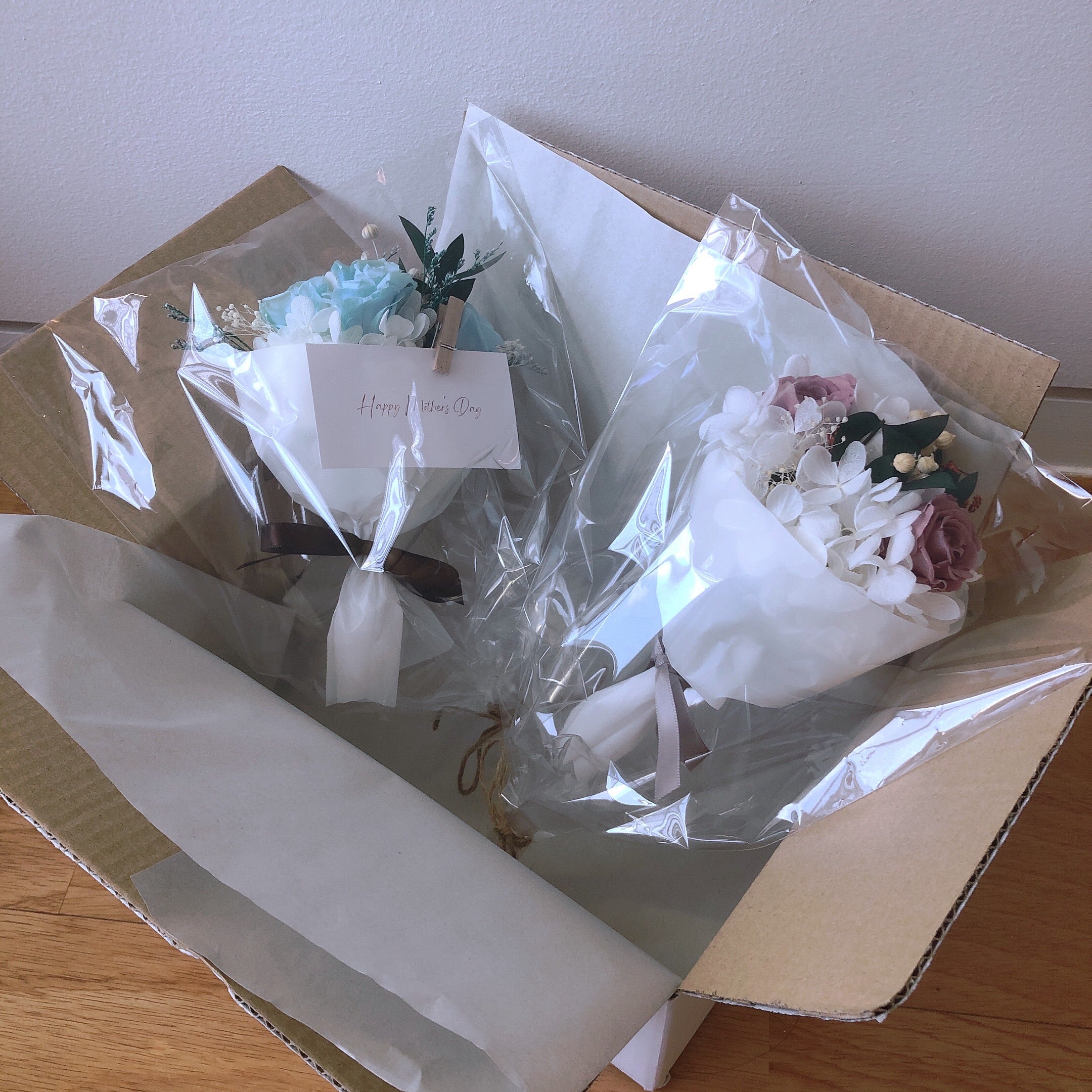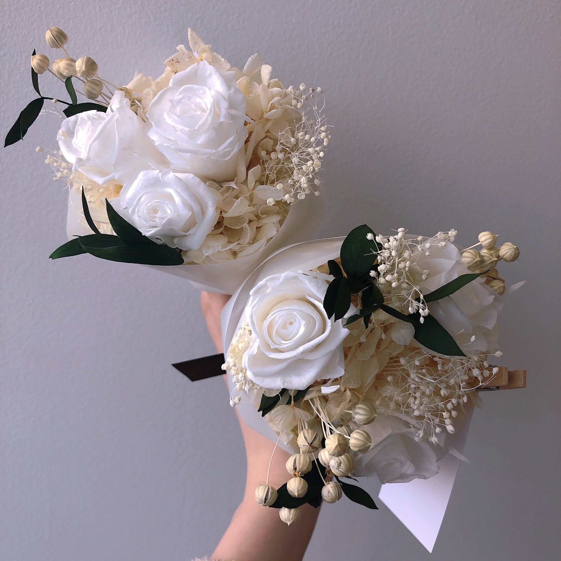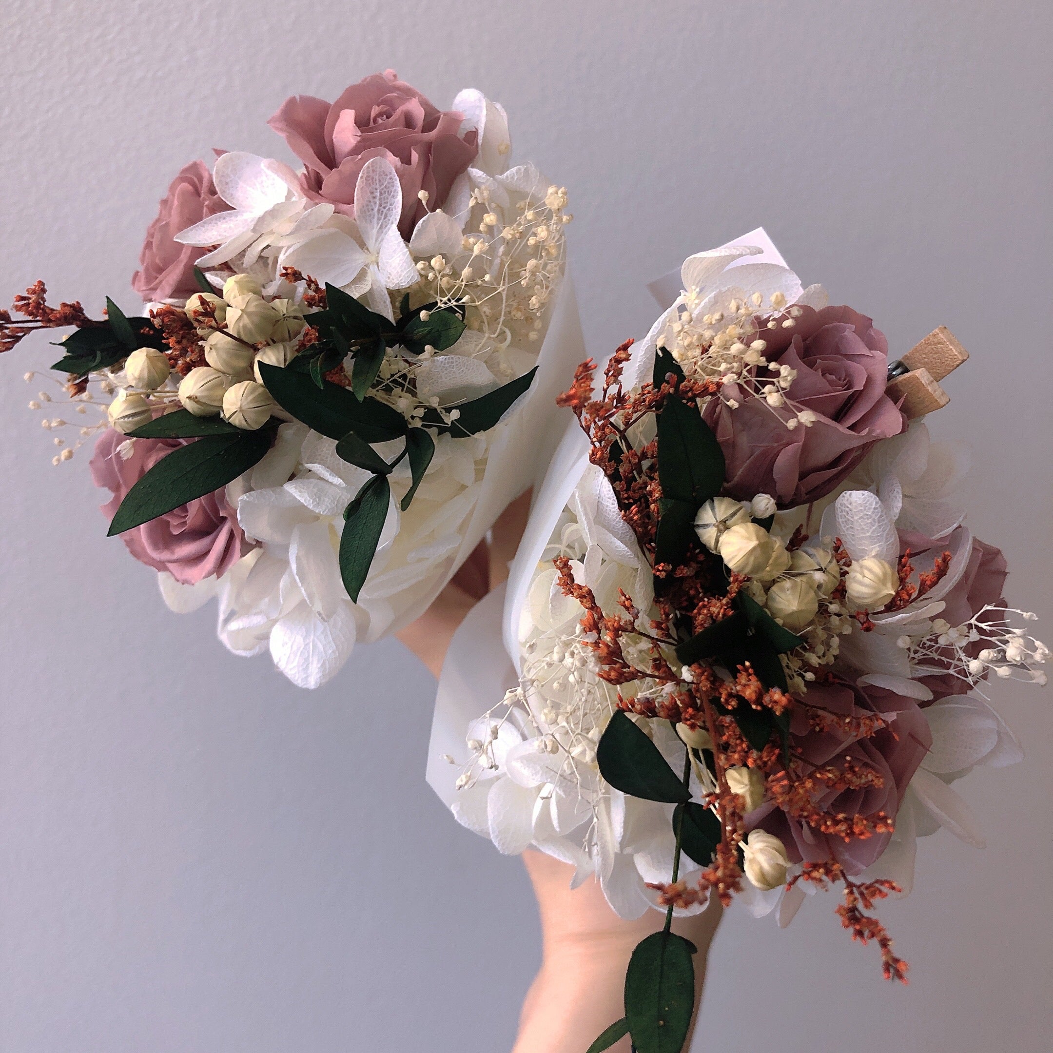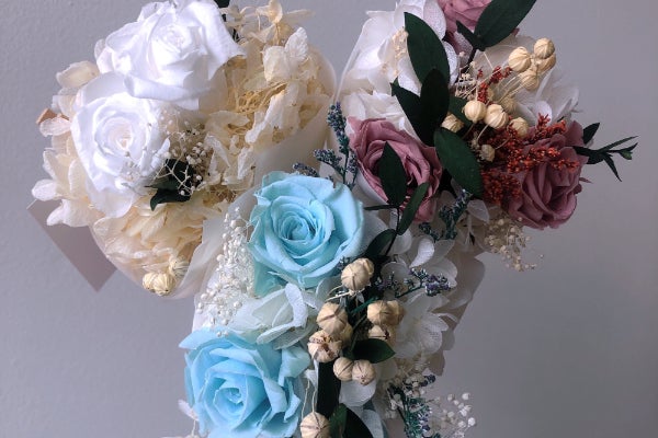 商品第1弾となる【枯れないブーケ】を作成しました。生花で作っていて、