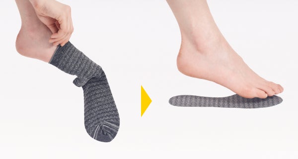 ④(説明動画のように)本品を丸めながら靴の中に入れ、内底面に装着させてください