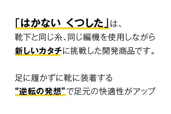 2022/07/04 12:00この度は、『はかない くつした』にご支援・ご協力を頂き誠にありがとうございました!皆様のお力添えにより、目標を達成する事が出来ました。心より御礼申し上げます。靴下製造の技術を使いながらも従来の靴下とは全く異なる形状の商品をご提供するにあたり、スタート前は少し不安もありました。しかし、支援募集をスタートしてみると、「このような商品を探していました」「これで足の悩みが解消されそうです」等のコメントを頂き、今回プロジェクトを実施して本当に良かったと感じました。これからも皆さまの足もとを「素足以上に足どり軽く」できるように研究開発していきます。今後ともどうぞよろしくお願いします!株式会社ナイガイ NAIGAI Lab もっと見る残り2日間です!