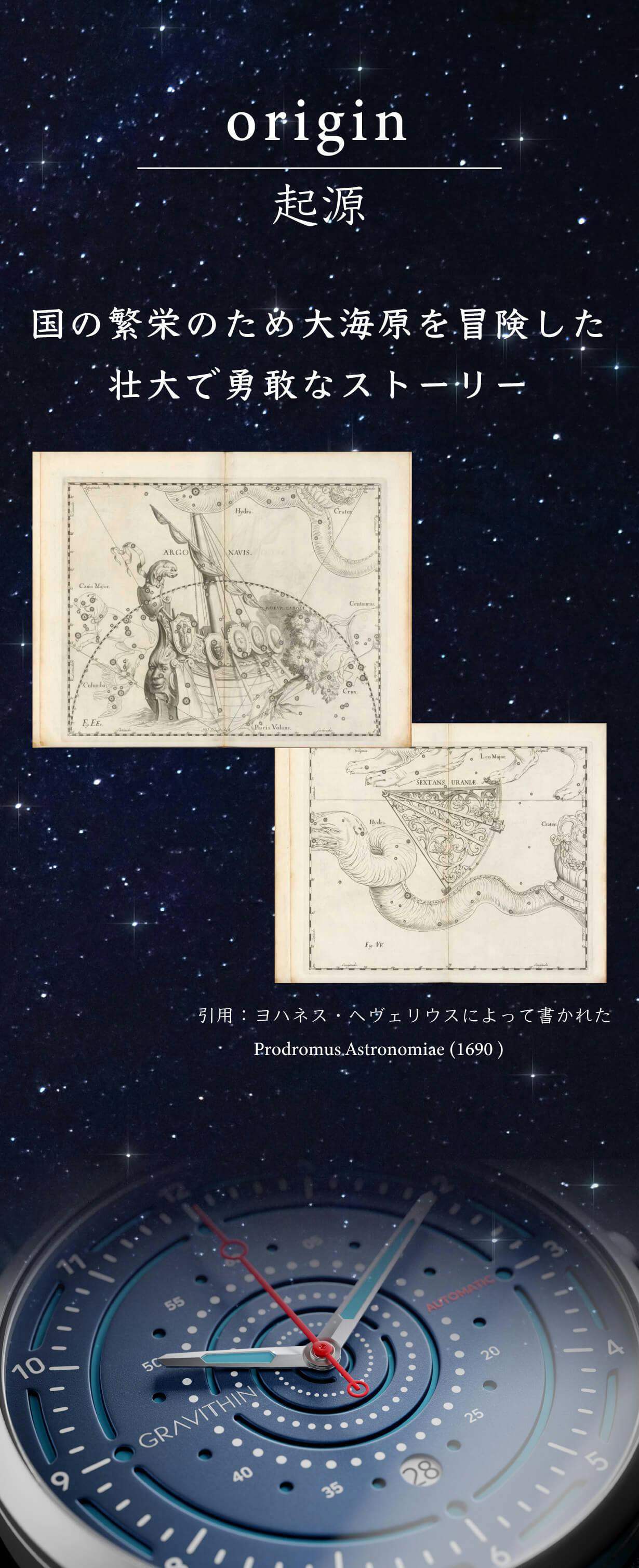 古代の航海では、夜空の星が現在地を特定する唯一の手掛かりでした。今でいうGPSとして実際に使われていた星の観測機「六分儀」を、スタイリッシュに文字盤に落とし込みました。
