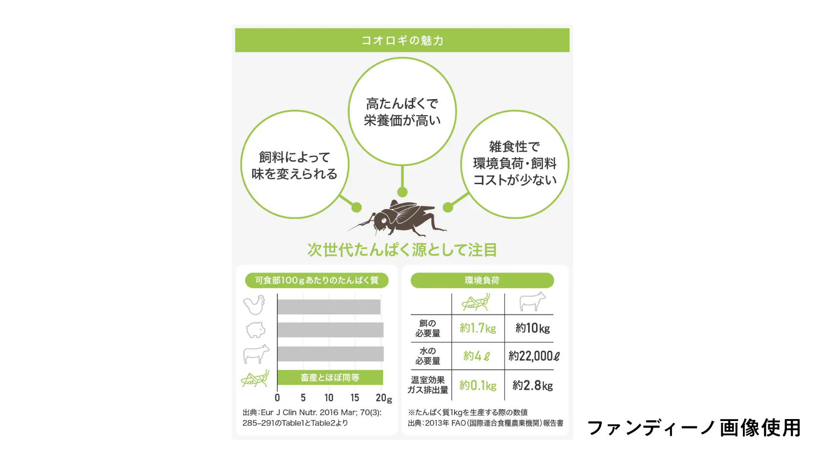 コオロギは牛、豚、鶏などの家畜と比べて生産に必要な水、飼料、土地、時間といったコストも圧倒的に少なくて済みます。