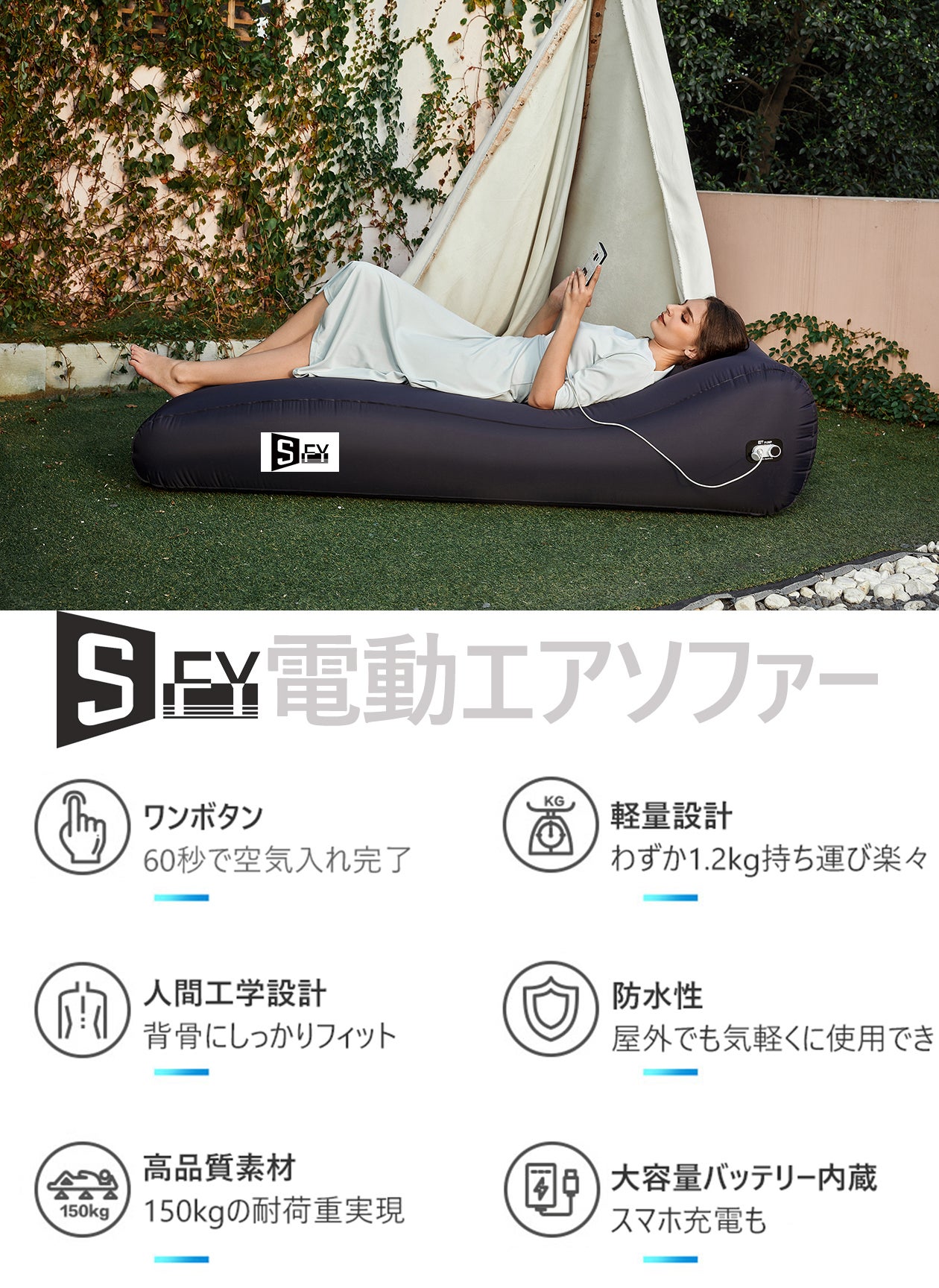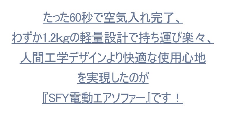 気軽に使える空気入れタイプながら、、ソファーとしての快適さにも妥協しないのがSFY電動エアソファーです。背骨にしっかりフィットしながら支え、膝も自然なカーブを保つように設計し、リラックス感を追求しました。