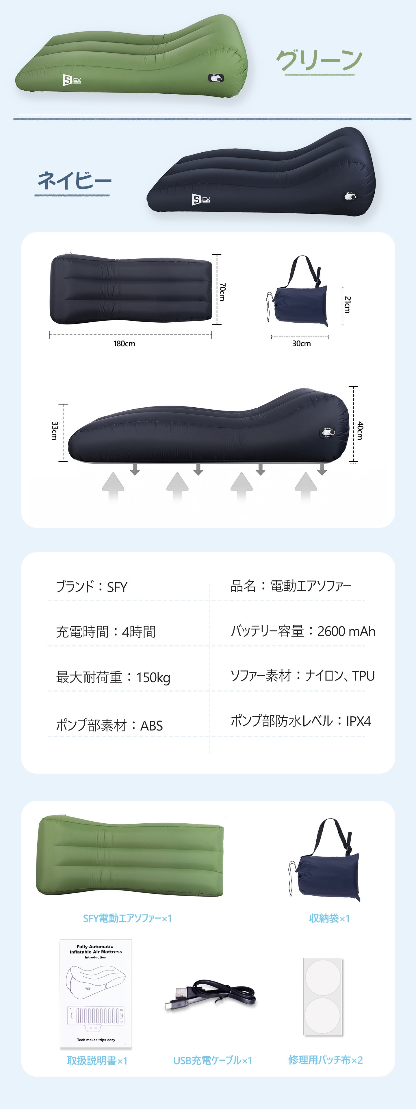 SFY電動エアソファーは簡単に折りたたんで専用バッグに入れられる設計で、持ち運びや収納に最適。