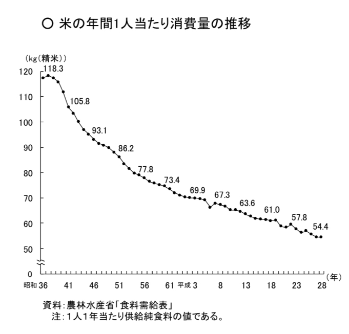 ただでさえ、農家さんは天候や災害に左右されて多くの苦労をしているにも関わらず、お米の需要は昭和37年をピークに減少し続けています。