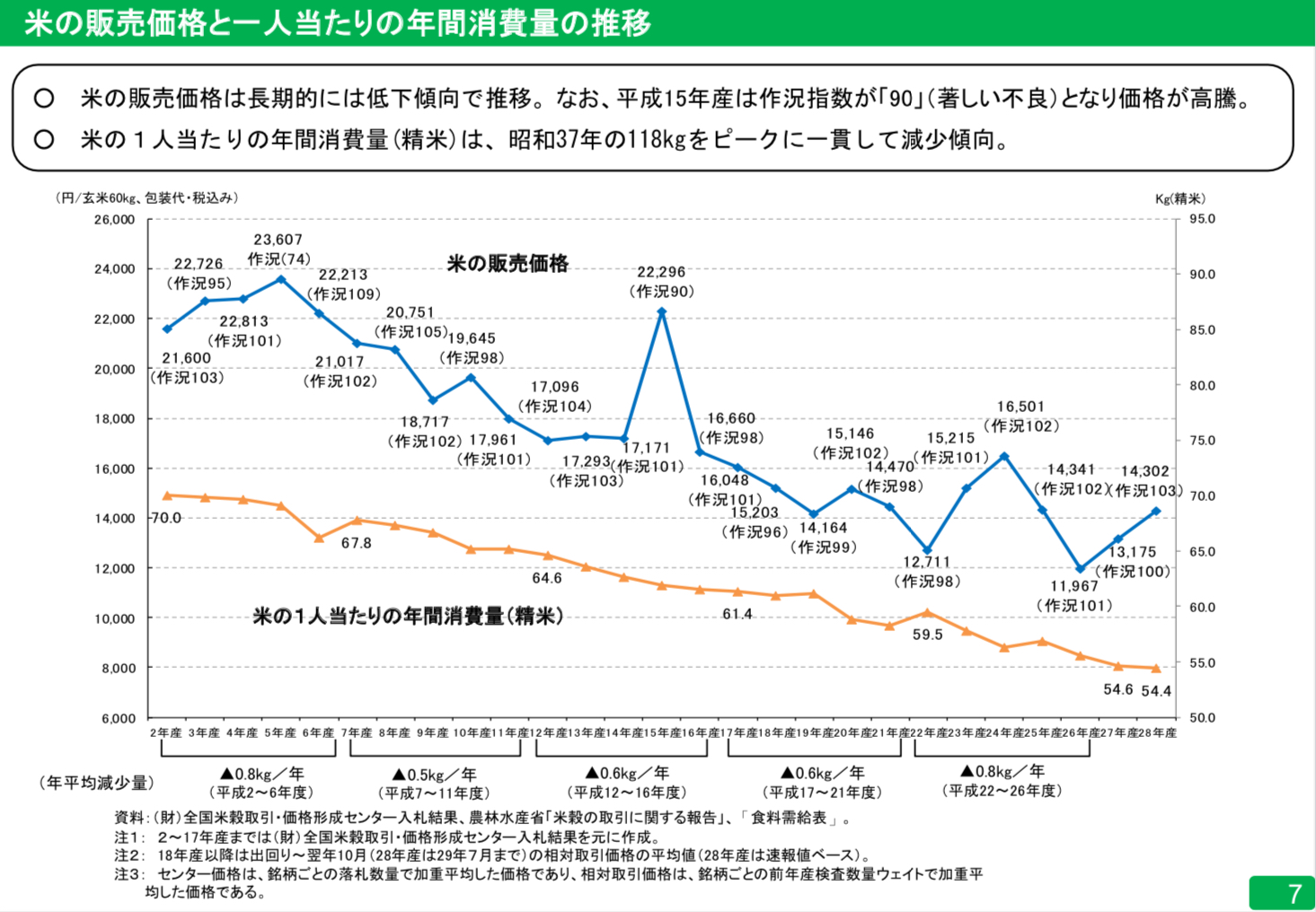そして、お米の消費量減少に伴い、お米の価格も下落しています。