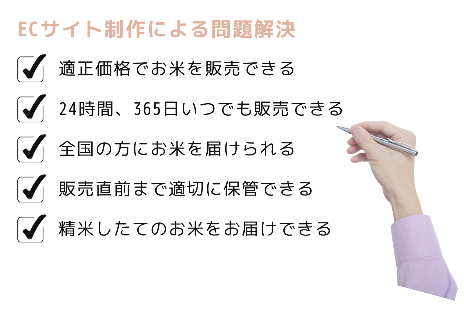 農業の専門家である生産者さんですが、オンライン販売の仕組み構築に苦労されている方は少なくありませんが、ECサイト制作によって解決できる問題はたくさんあるのです。