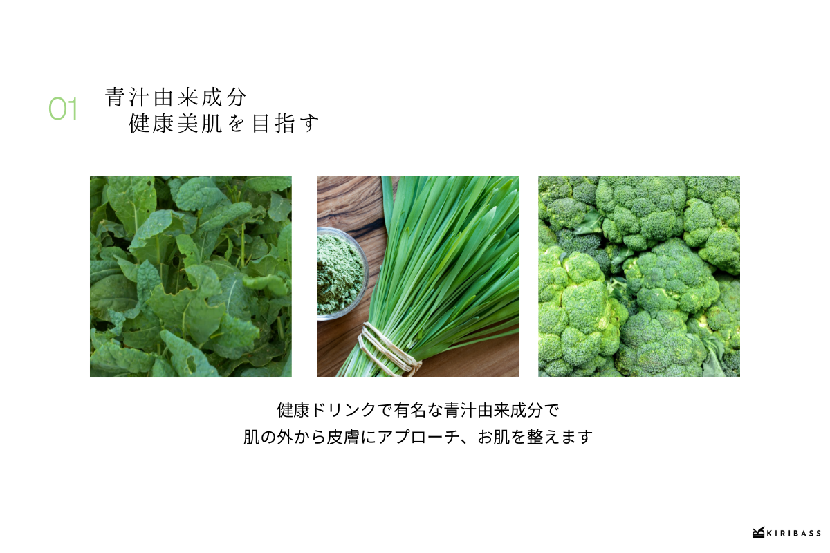 KIRIBASSの化粧品部門では、日本独自である【青汁】を配合した、青汁化粧品シリーズの第一弾