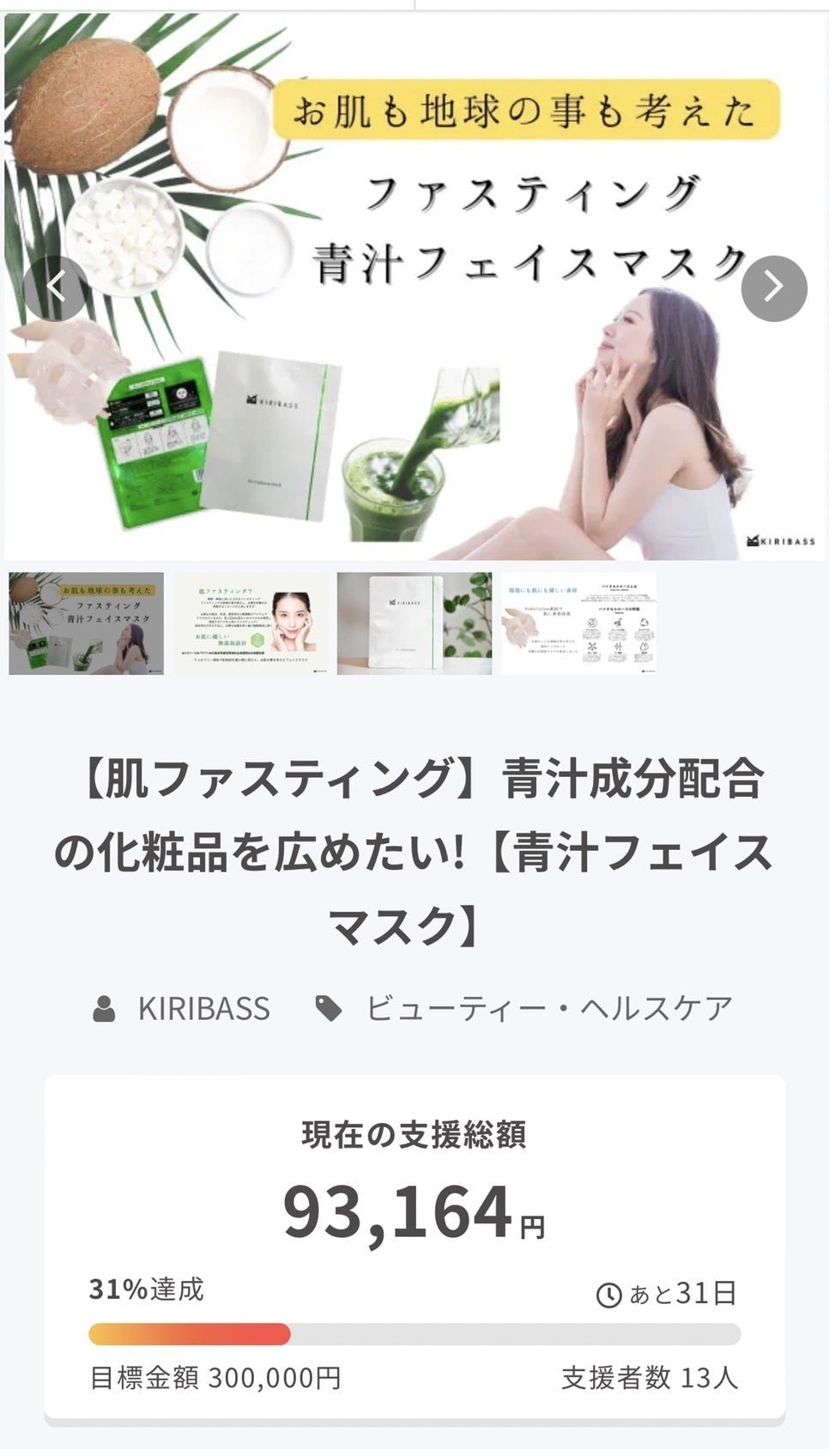 2022/11/06 19:51まず、ご支援して下さっている方々ありがとうございます。とても嬉しいです。沢山の方に応援されていると実感し、より気が引き締まりました。ご報告青汁化粧品第一弾は国内販路として超優秀な楽天ショップ様と連携致しますショップ代表者様とお話しする機会を頂き、一瞬で【ああ、、好き!この方と仕事したい!】と思いました。そんな優秀な方々との業務連携をしていく中で、クラウドファンディングの成功はKIRIBASSにとって、最初の信頼度と言えます。必ず成功させる為に是非皆さまのお力を貸して頂きたいです、頼らせて下さい。ご友人やご家族にもこのクラウドファンディングを紹介して下さい。青汁の化粧品がある事を言ってみて下さい。よろしくお願い致します。いつもありがとうございます、必ずやり遂げます。 もっと見る