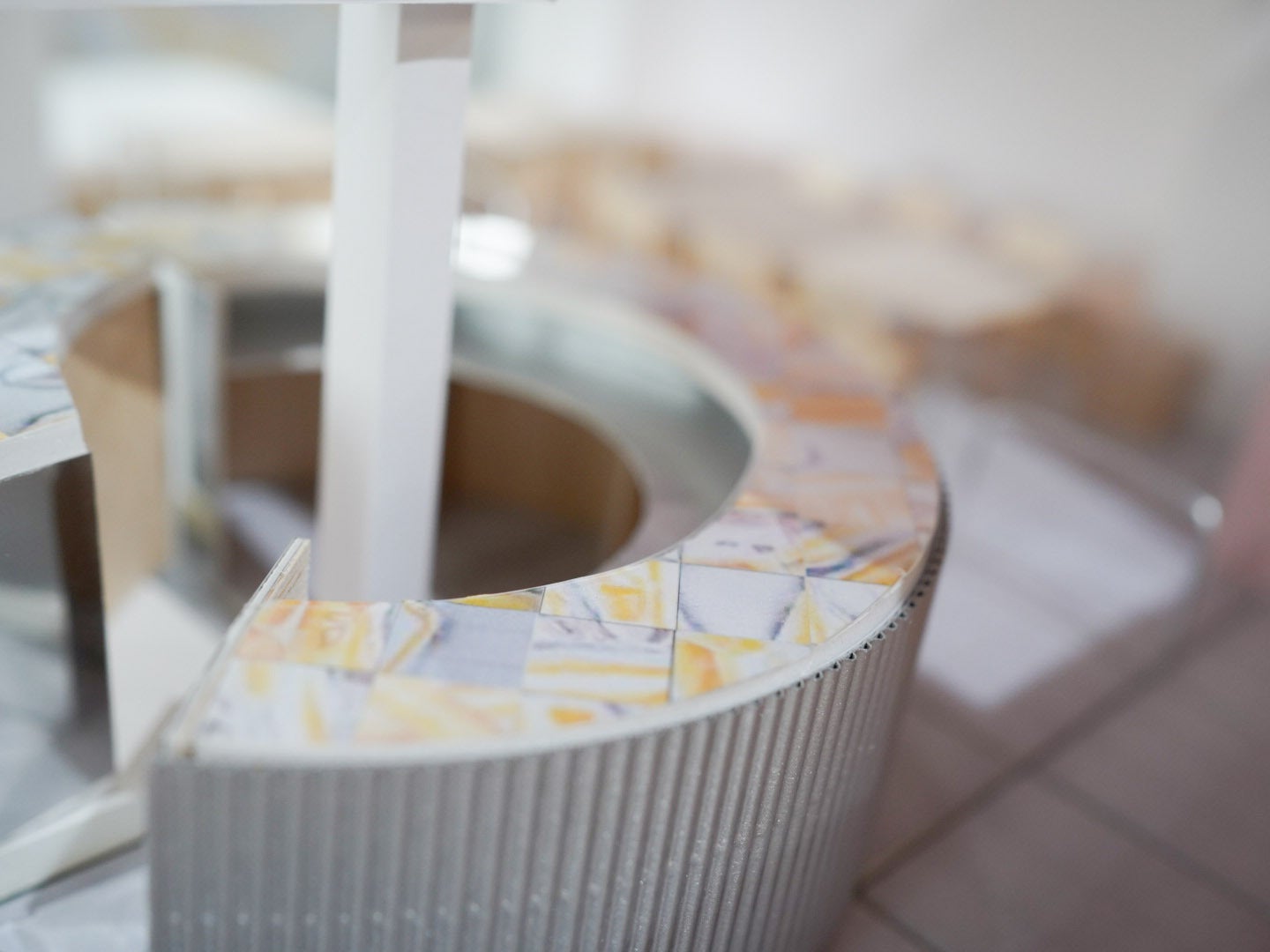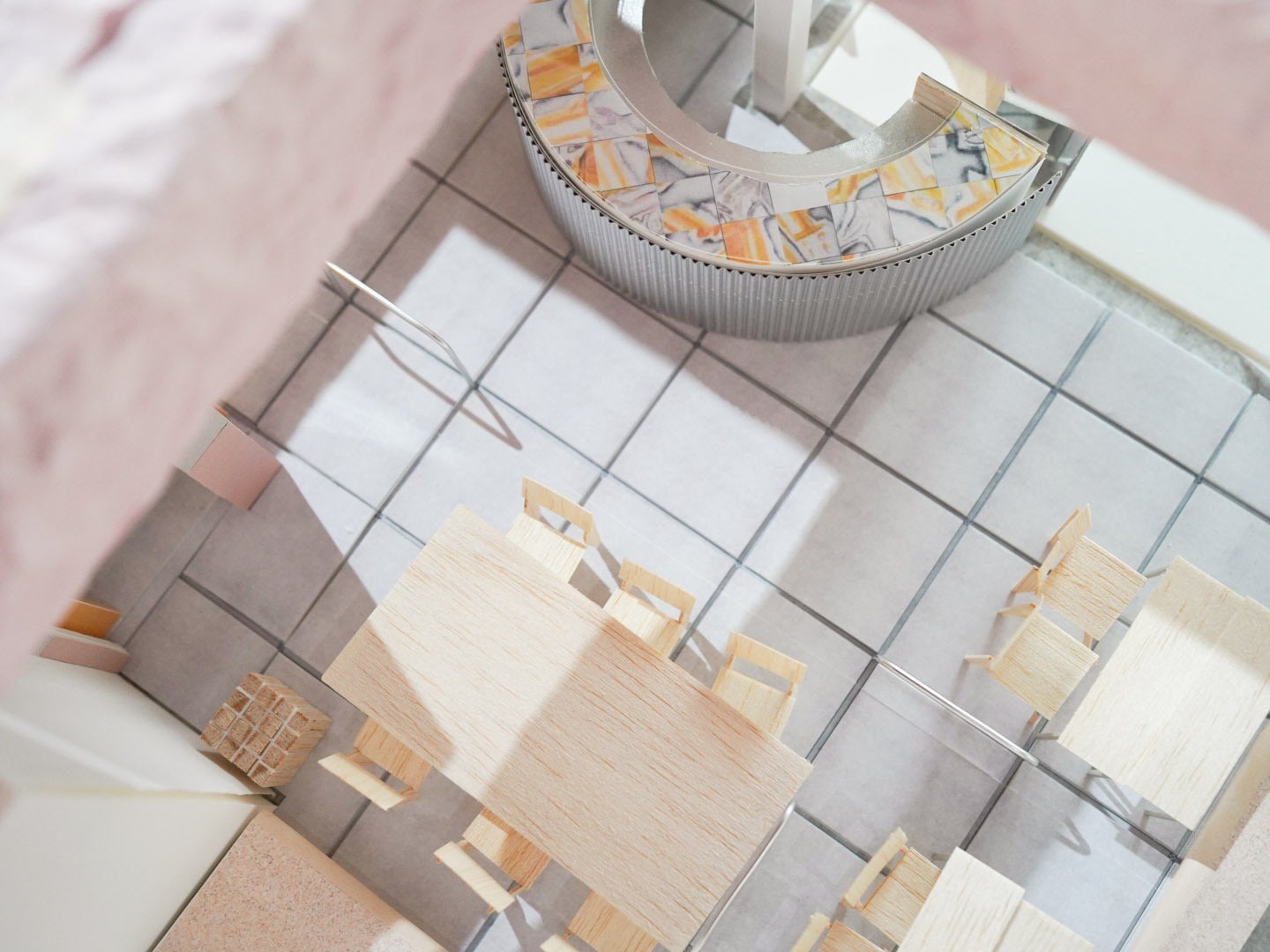 ビルが解体されるときに、いつか再利用できるよう保存しておいたフレスコ画を、さらに断片化し、樹脂で固形化し、喫茶七番のシンボルとして円形カウンターに使用します。過去から未来へ、古いビルから新しいビルへとアートをつなぐチャレンジです。