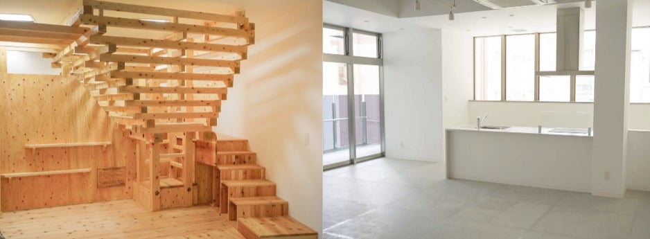 ➋都市の木質化による掲示板とラウンジ空間
