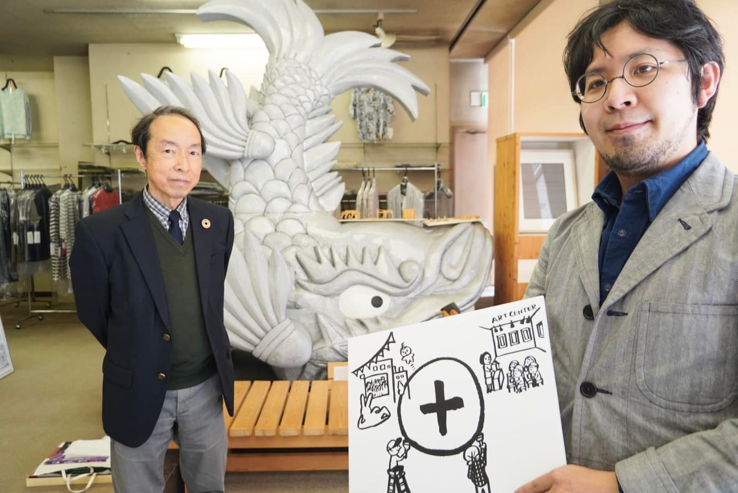 写真は町内会長の滝さんとアーティストの前川さん。