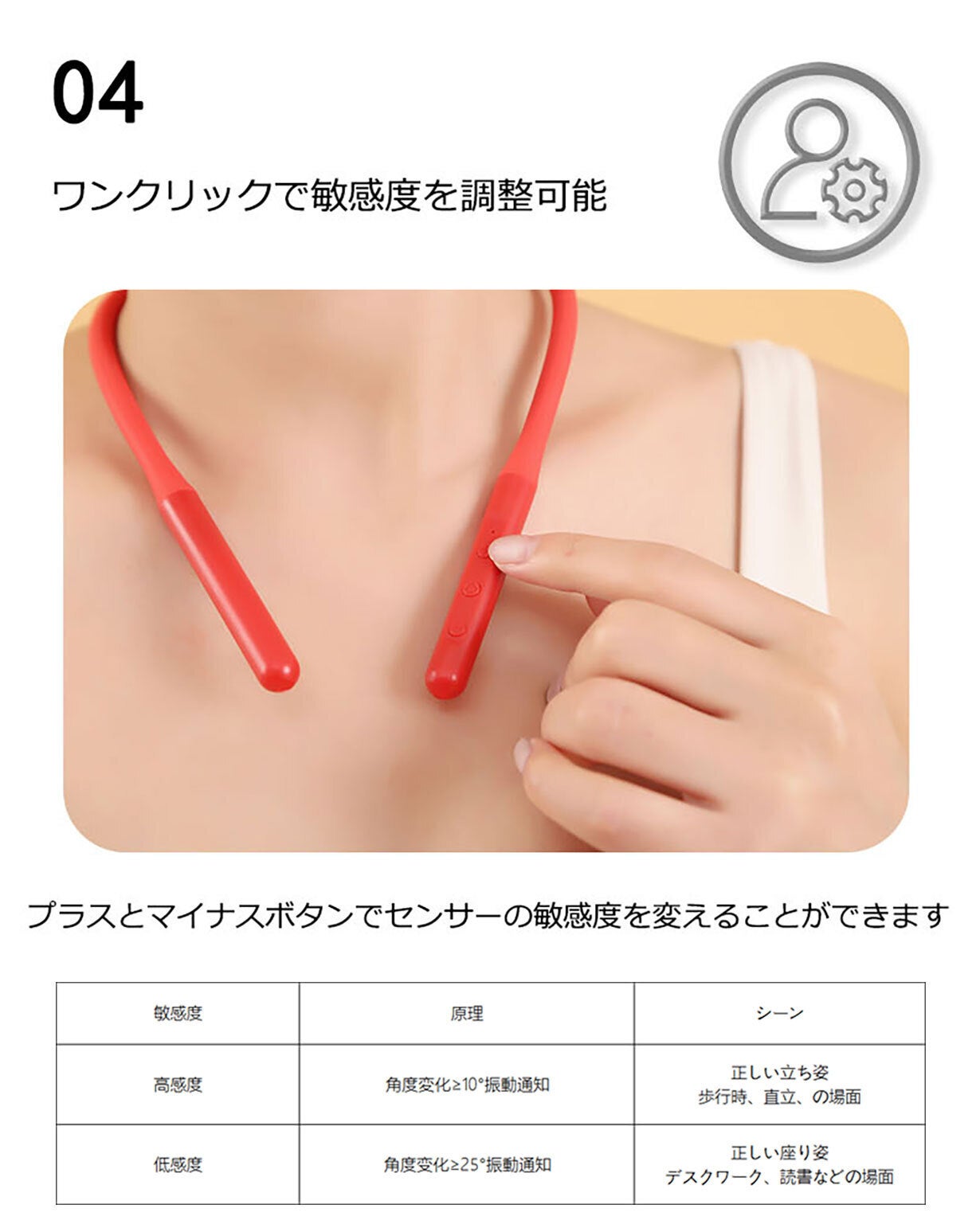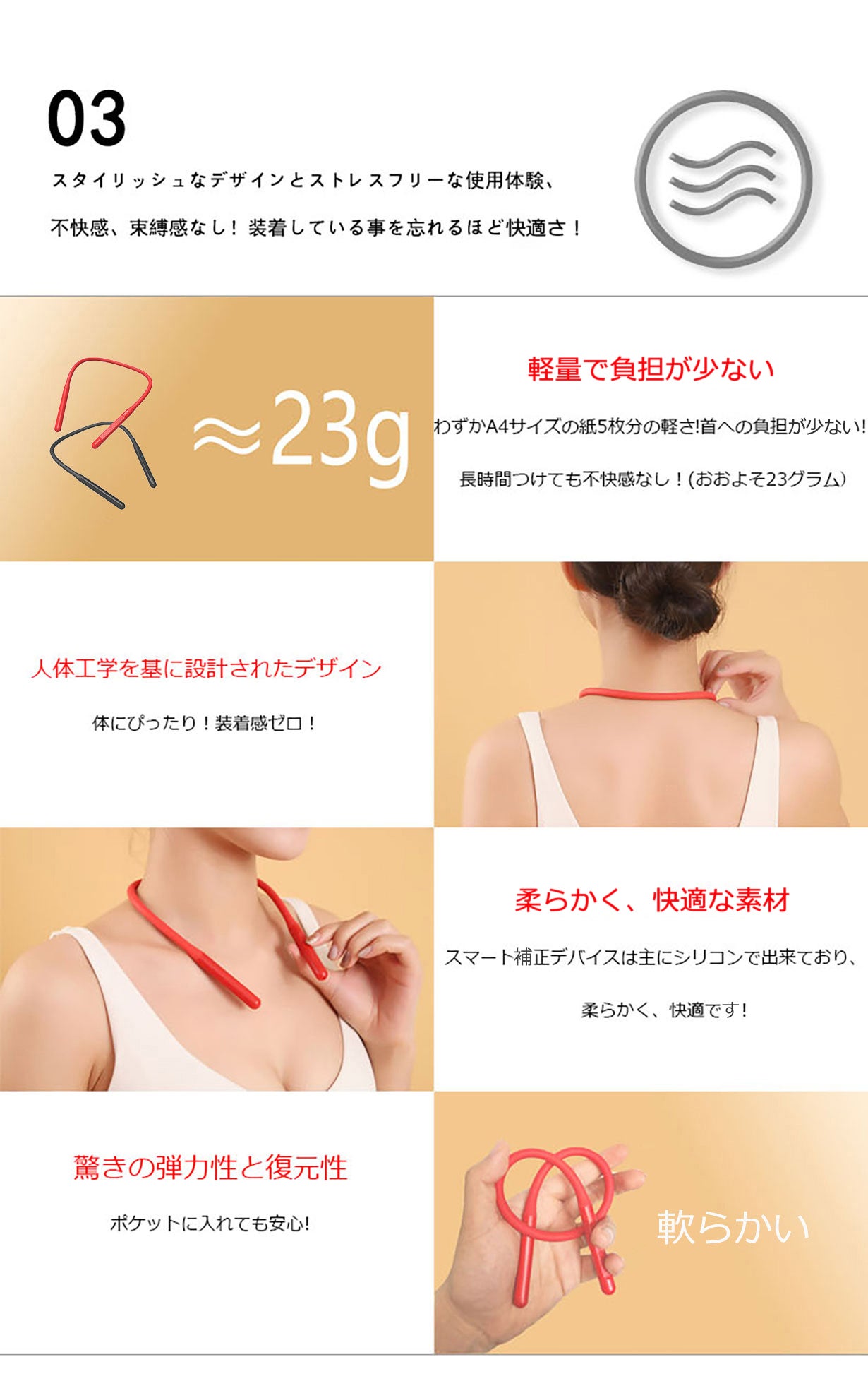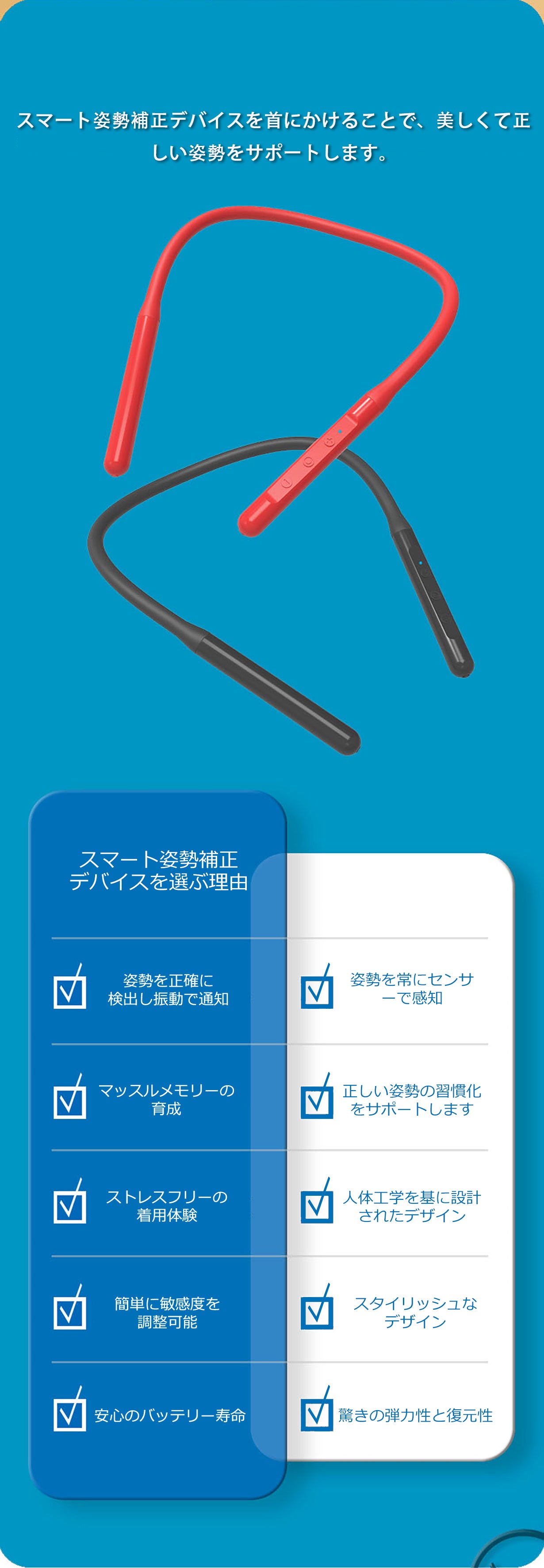 スマート姿勢補正デバイスを首にかけることで、美しくて正しい姿勢をサポートします。