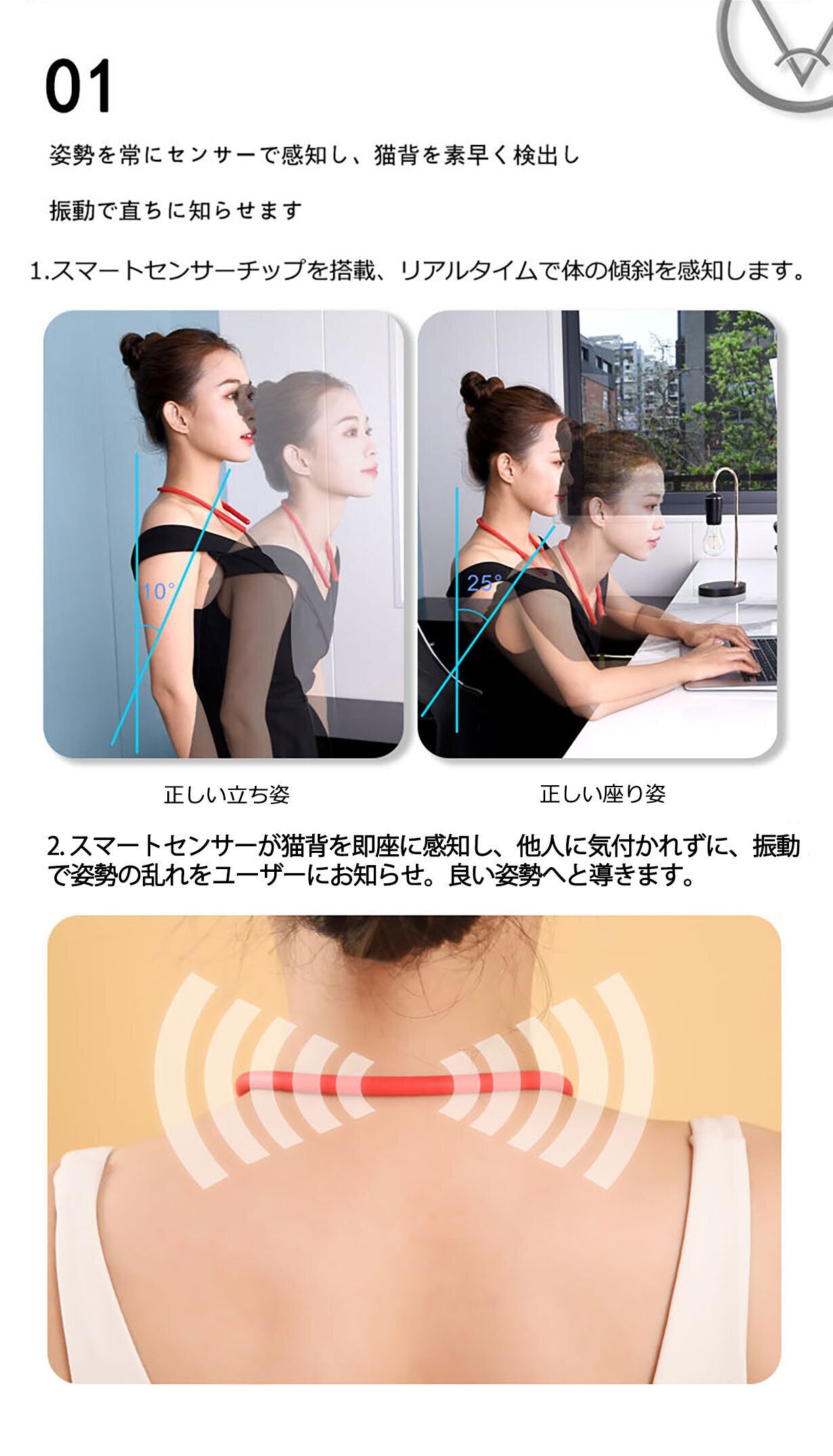 ❶力で背中を縛る姿勢補正器と異なり、習慣面から、猫背を補正します。センサーが首と背中の曲がり具合を感知し、振動でユーザに悪い姿勢でいることを通知します。