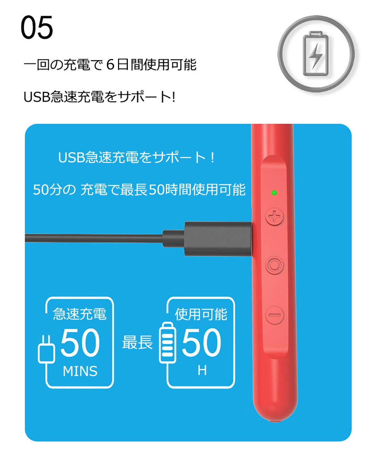 ❶一日8時間の着用でも、一回の充電で6日間使用可能です。USB急速充電をサポート!50分の 充電で最長50時間使用可能です。(※使用可能時間は、動作環境により異なる場合がございますこと、ご了承ください。)