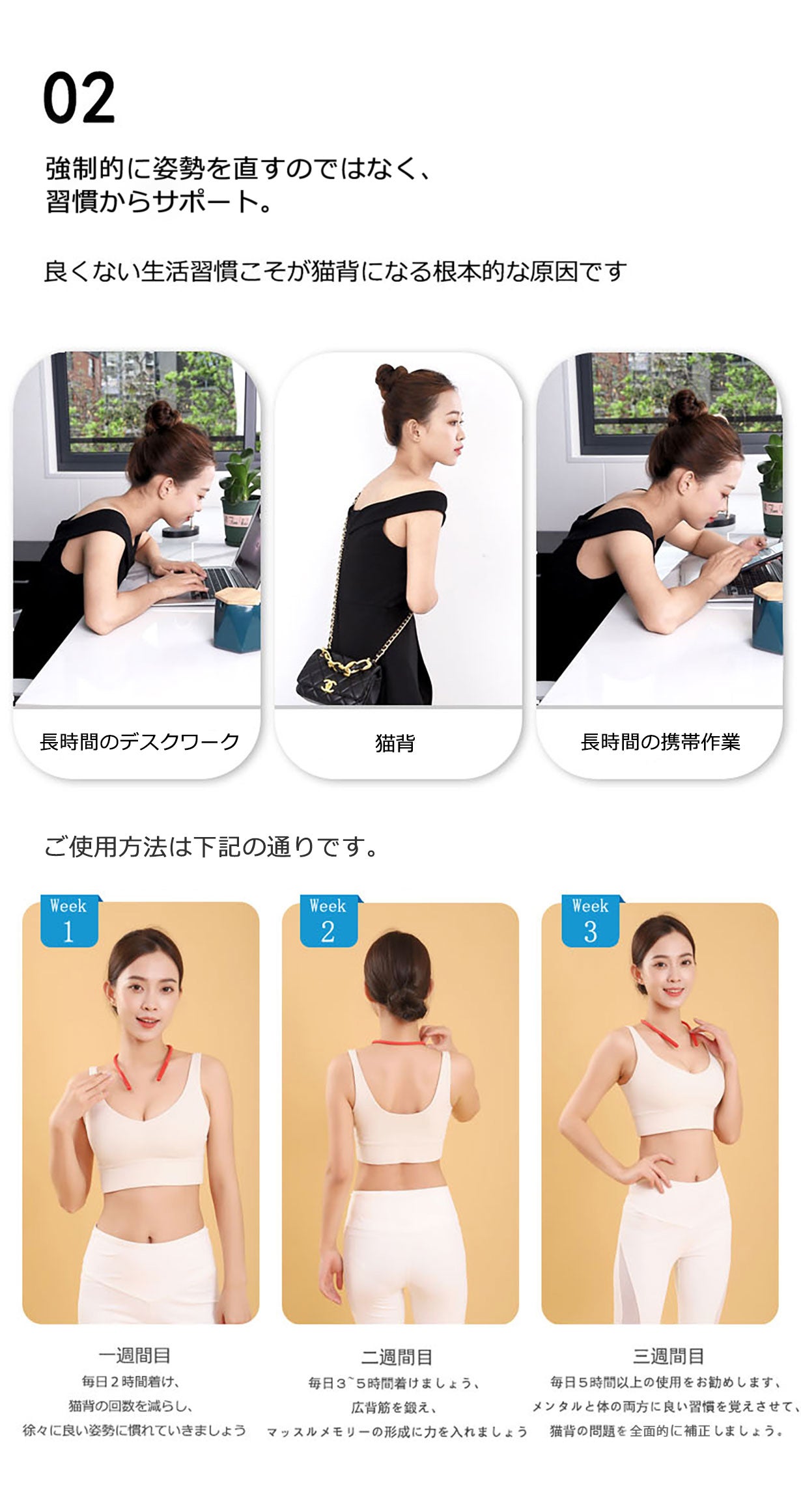 ❷“束縛”による猫背を治す方法は一時的なものに過ぎません。重要な事は、正しい姿勢の大切さを理解し、常に正しい姿勢を保つことを“意識”することです。“正しい姿勢の維持”のシグナルを筋肉に伝達し、補正をサポートします。
