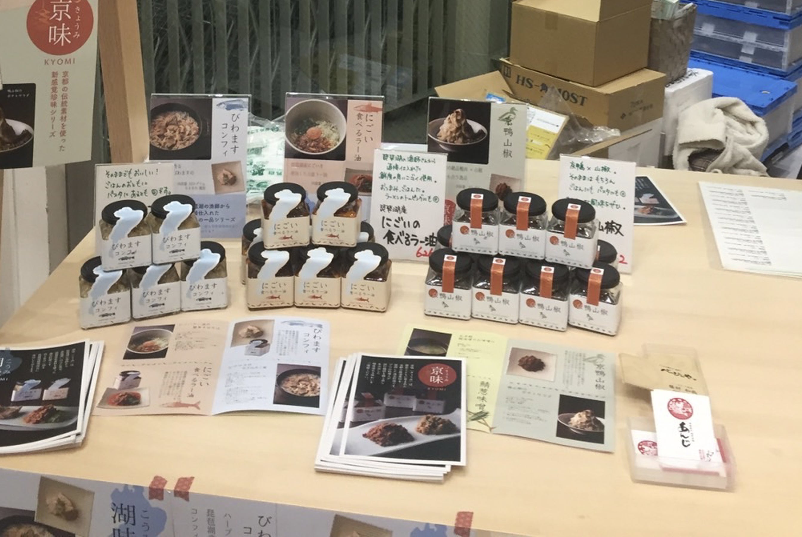 お店以外では、阪急洛北スクエアの催事でビワマスコンフィや鴨山椒、にごいの食べるラー油などを販売させて頂きました。