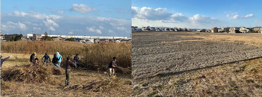 除草作業中の写真(左)と除草後の写真(右)(2020年11月撮影)。中川区供米田地域(2.9ha)のうち、76aが遊休農地であった。