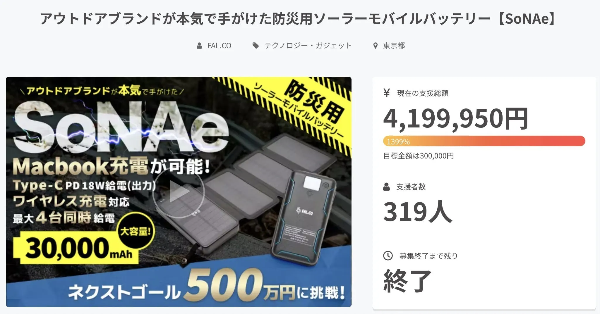 前回の先行販売クラウドファンディングで累計319名から合計419万円もの支援が集まった防災用モバイルバッテリー「SoNAe」が再登場!