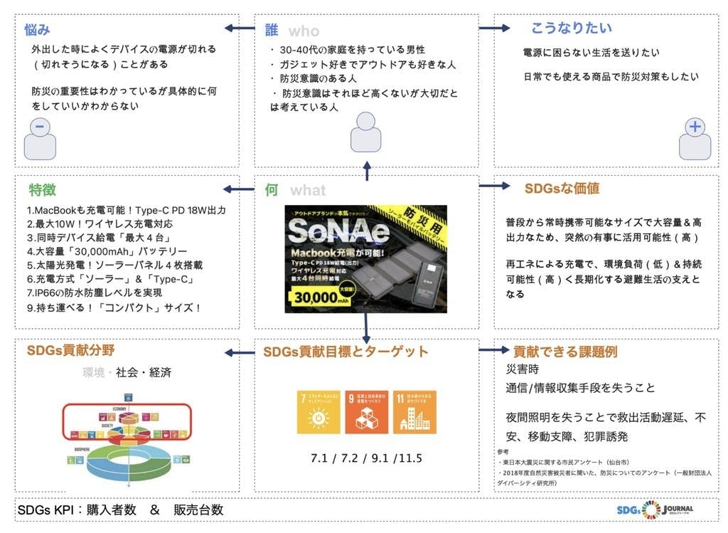実はSDGsなクラウドファンディング商品事例を図解|アウトドアブランドが本気で手がけた防災用ソーラーモバイルバッテリー【SoNAe】