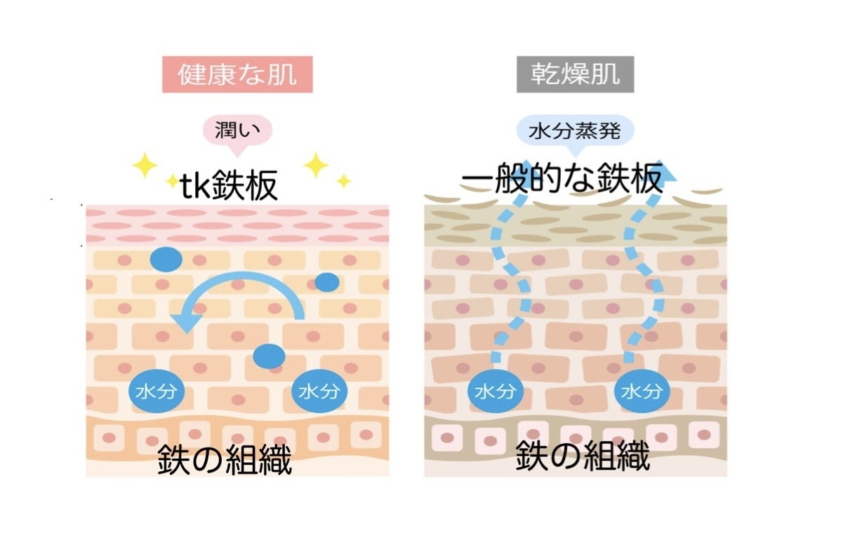 ②TK鉄板は組織構成が均等に並んでおり(お肌のキメが細かく整っている)、材料に不純物も少ないです。だから、冷めた時に組織(毛穴)がしっかりと閉じ、油を鉄板の中に閉じ込めてくれるので、蓄熱効果と保温効果が持続します。だからこそ『冷めても美味いんよ』と言ってもらえるのです。