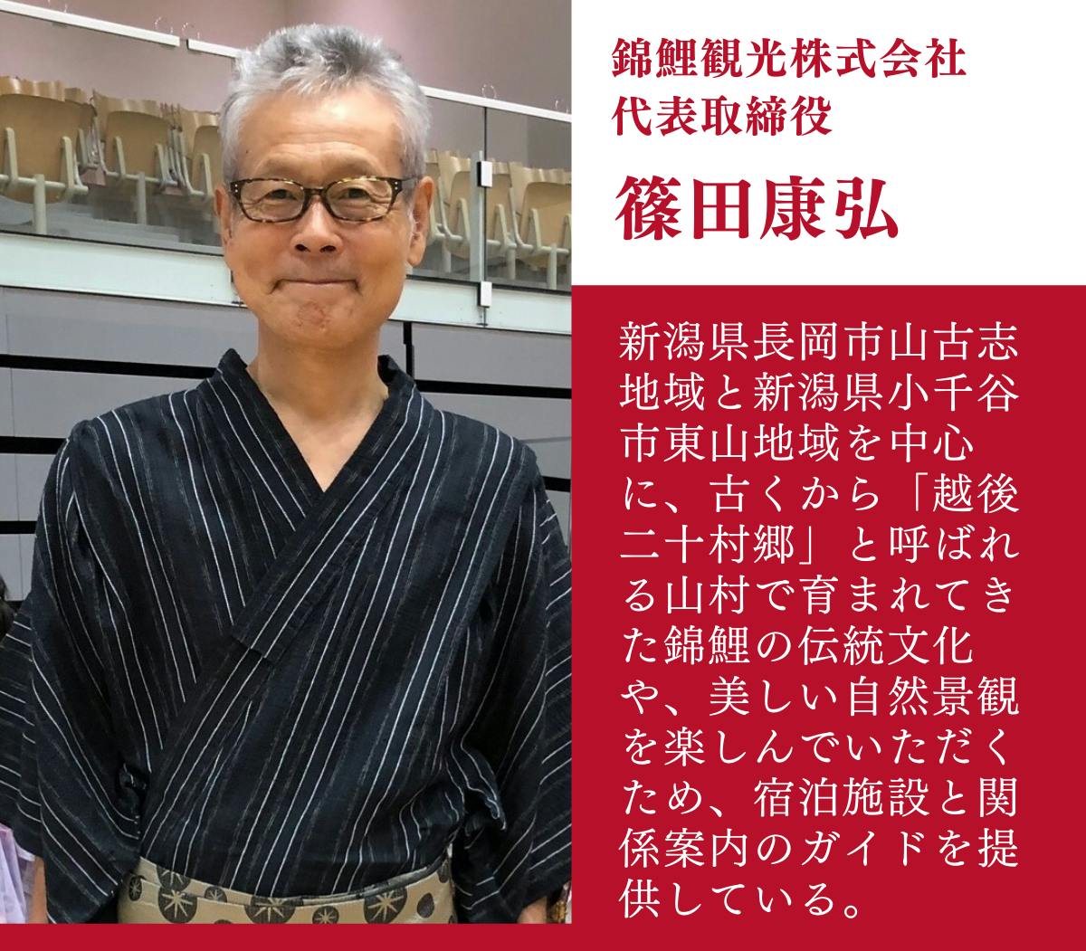 はじめまして! 錦鯉観光株式会社の篠田康弘と申します。数あるプロジェクトの中からこのページをご覧いただき、感謝申し上げます。