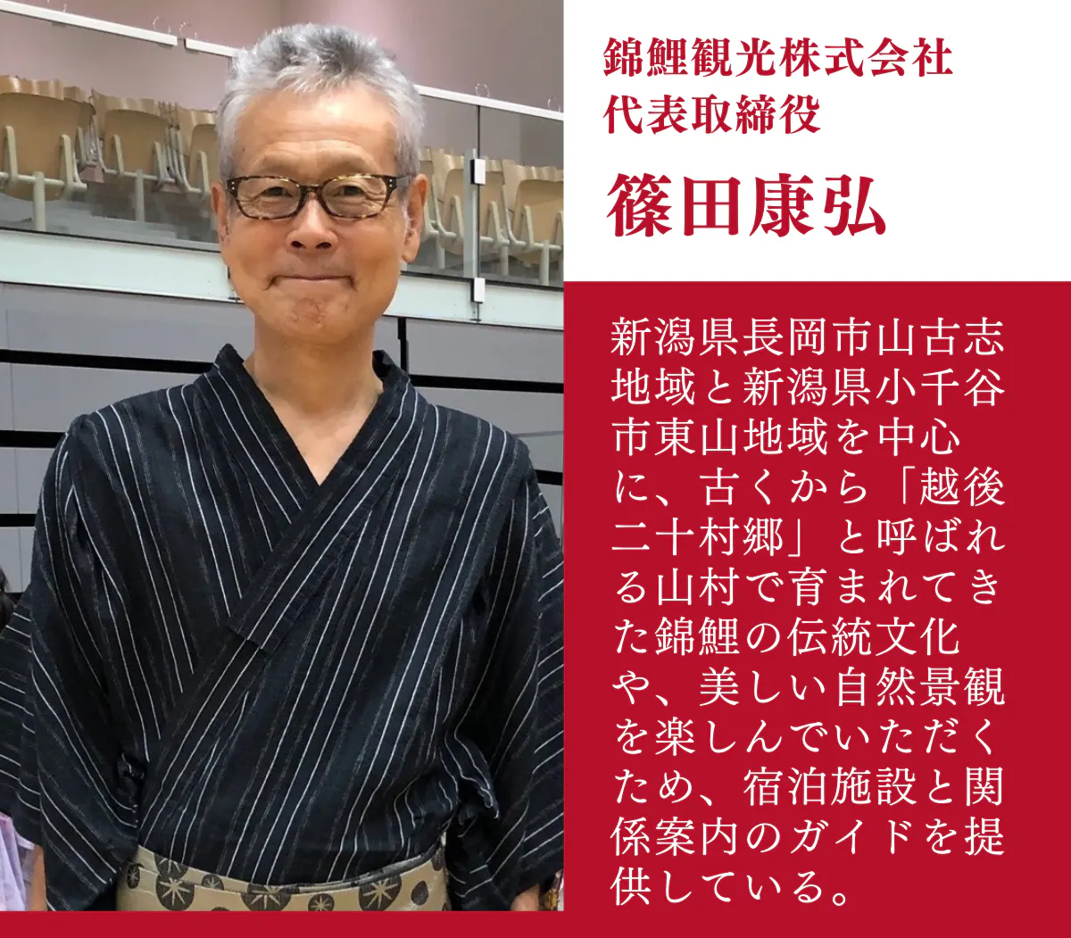 正直に申し上げると、「この地域には良いところがたくさんある」と自信はあるのですが、観光PRはとても難しいです。しかし、このたび観光振興に力を入れていくことを決意し、錦鯉観光株式会社を設立するために手続きをしております。こう踏み切れたのは、2017年から地道に延100名の方々に長岡にお越しいただき、錦鯉の見学や宿泊をされた方々からの感想をいただけたことがとても大きいです。