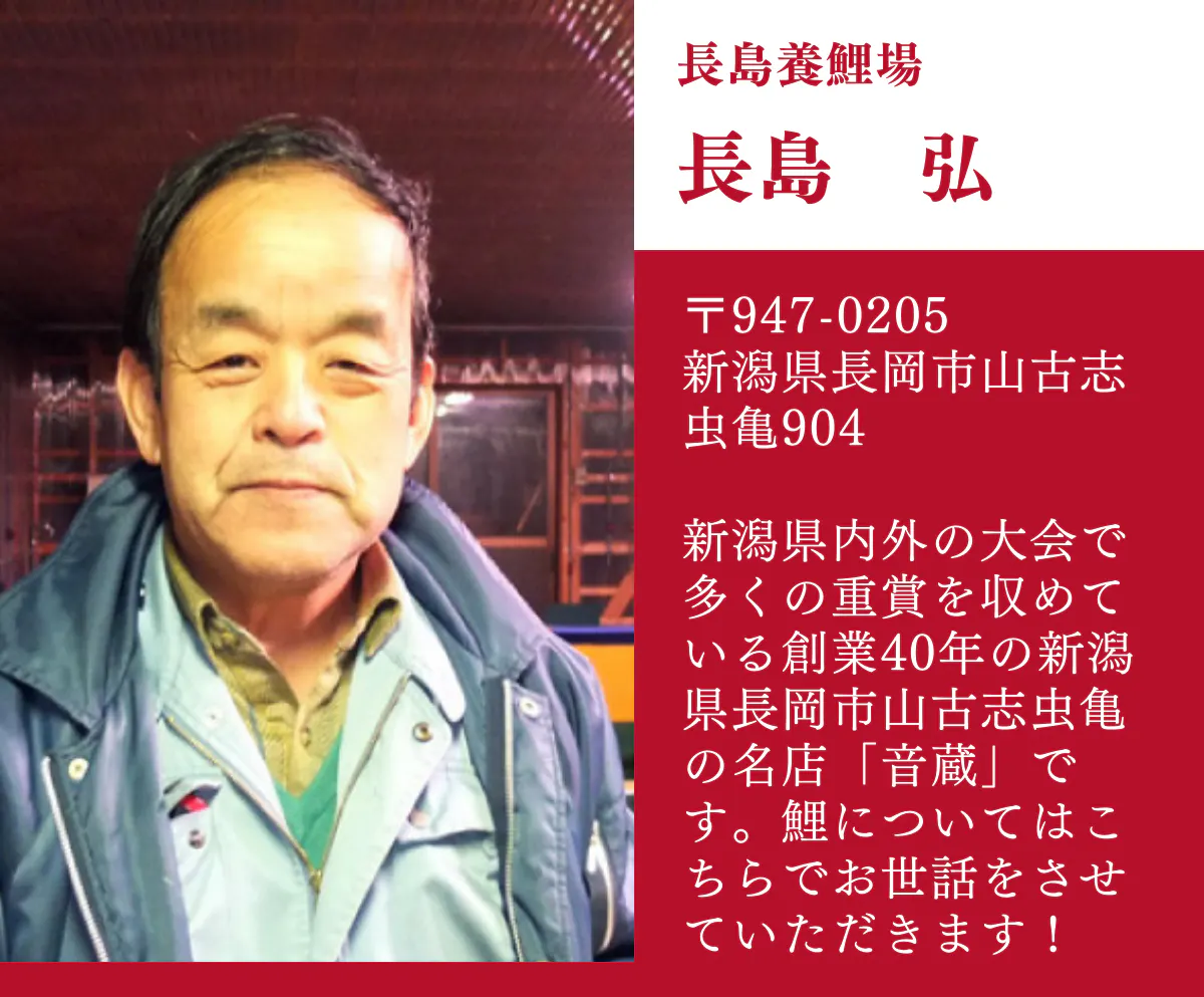 二十村郷が壊滅的な被害を受けた平成16年の中越地震後、錦鯉は復興のシンボルとなりました。「一般の方も楽しんでいただきたい。 高い鯉ばかりでもない、リーズナブルで素敵な鯉もたくさんいる。 特別敷居が高いわけじゃない。 地域の魅力、江戸時代からの日本の文化、 知っていただけていないのはもったいない! 」と思い、これまで地道に市外からお越しいただいた方々に紹介してきました。