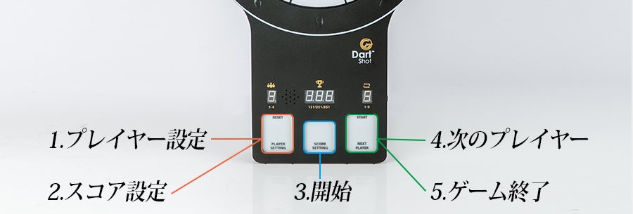 A:DartShotは、ダーツのルールを基にしたレーザーガンで遊ぶ製品です。ゲームの進むペースを速めるため、ダーツのルールの半分の数字、選択点数を151、251、351に変更しました。