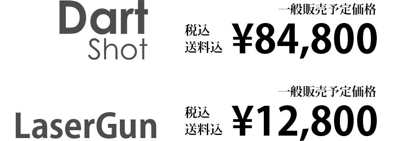 商品構成:DartShot、LaserGun、ACアダプター、単4電池(試供品1本)、保証書、DartShot取扱説明書、LaserGun取扱説明書