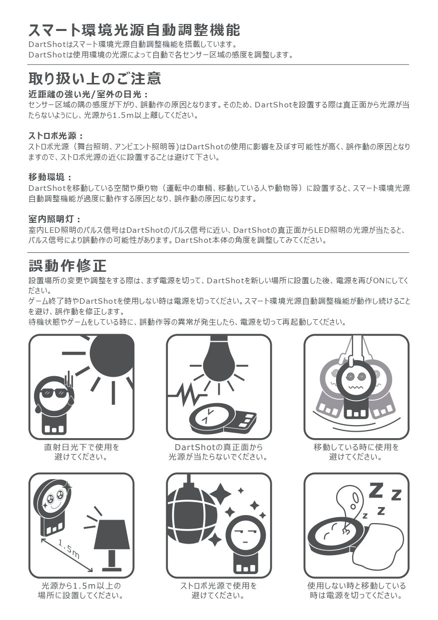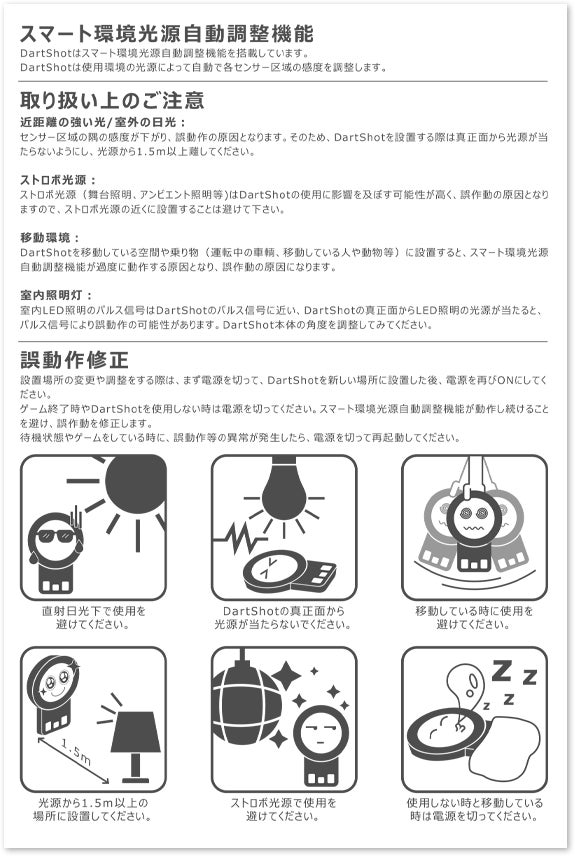 A:DartShotは電源を入れた際に自動で環境光に合った明るさに調整されますので、室内(蛍光灯)でもご使用いただけます。しかし、一部LED照明等はDartShotの誤作動の原因になる可能性があります。よってなるべく室内の照度を落とし、DartShotの盤面に光が当たらないようなご使用をお薦めします。詳しくは付属の説明書をご覧下さい。